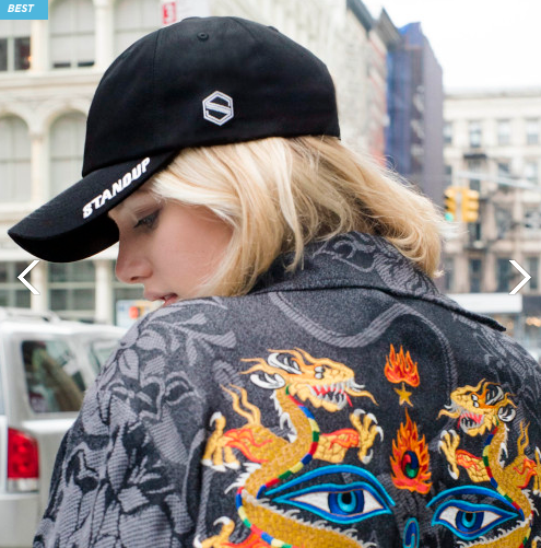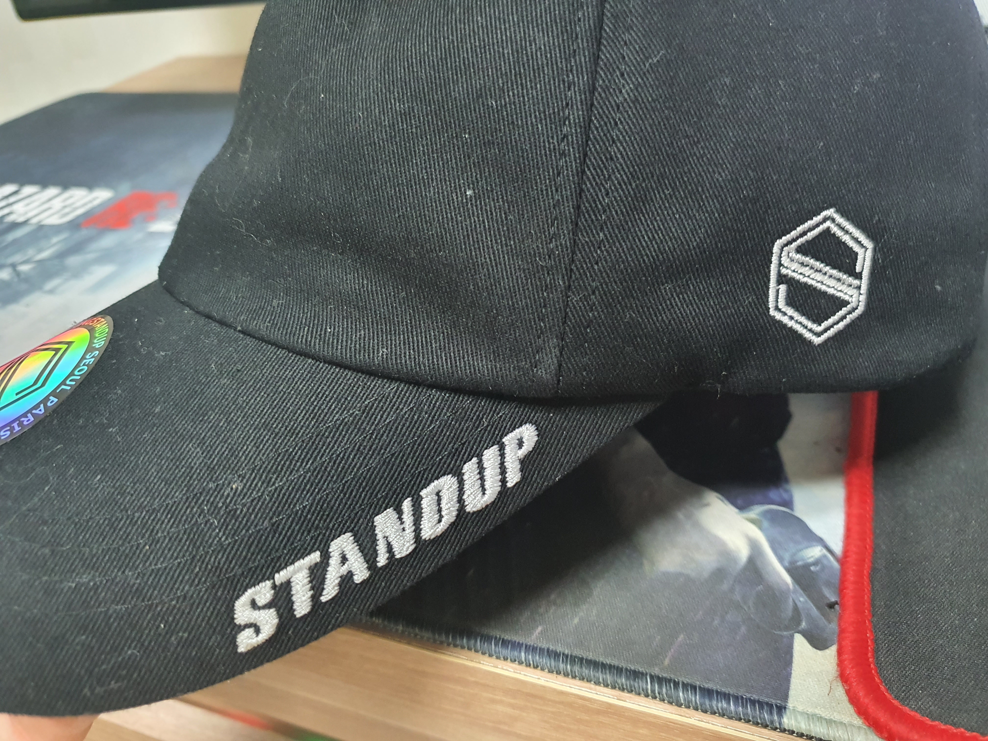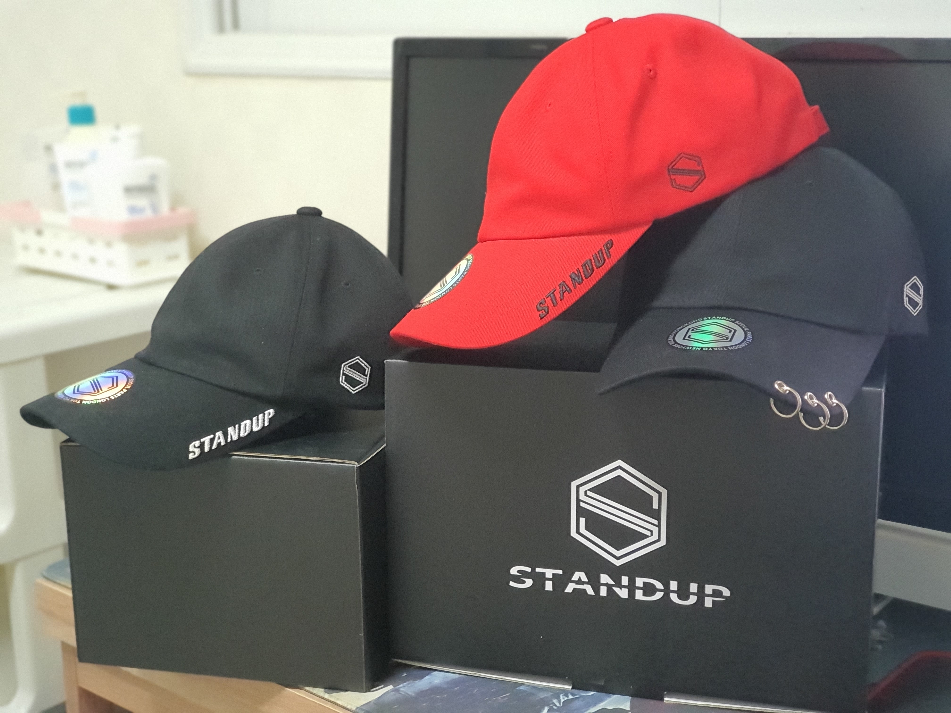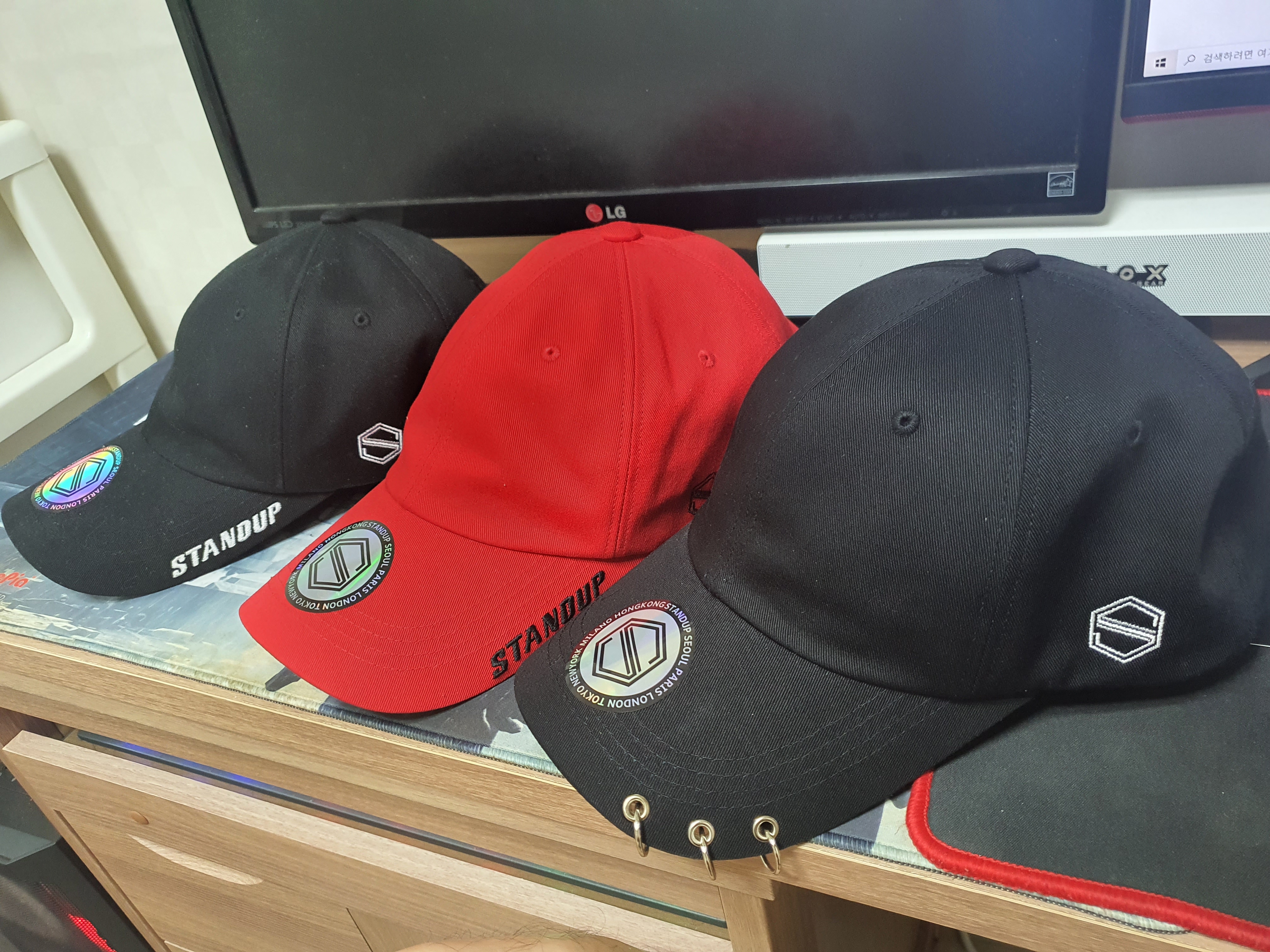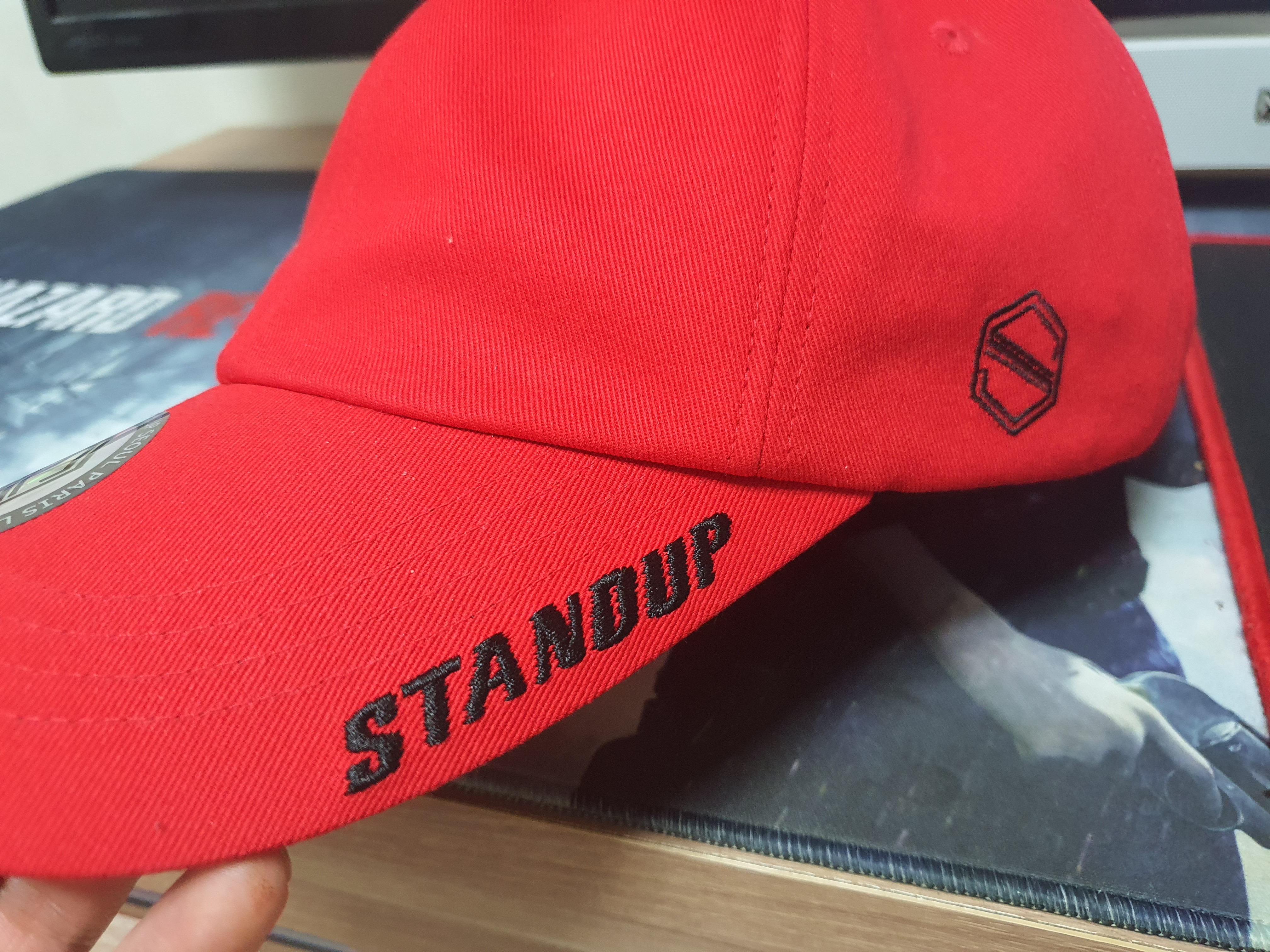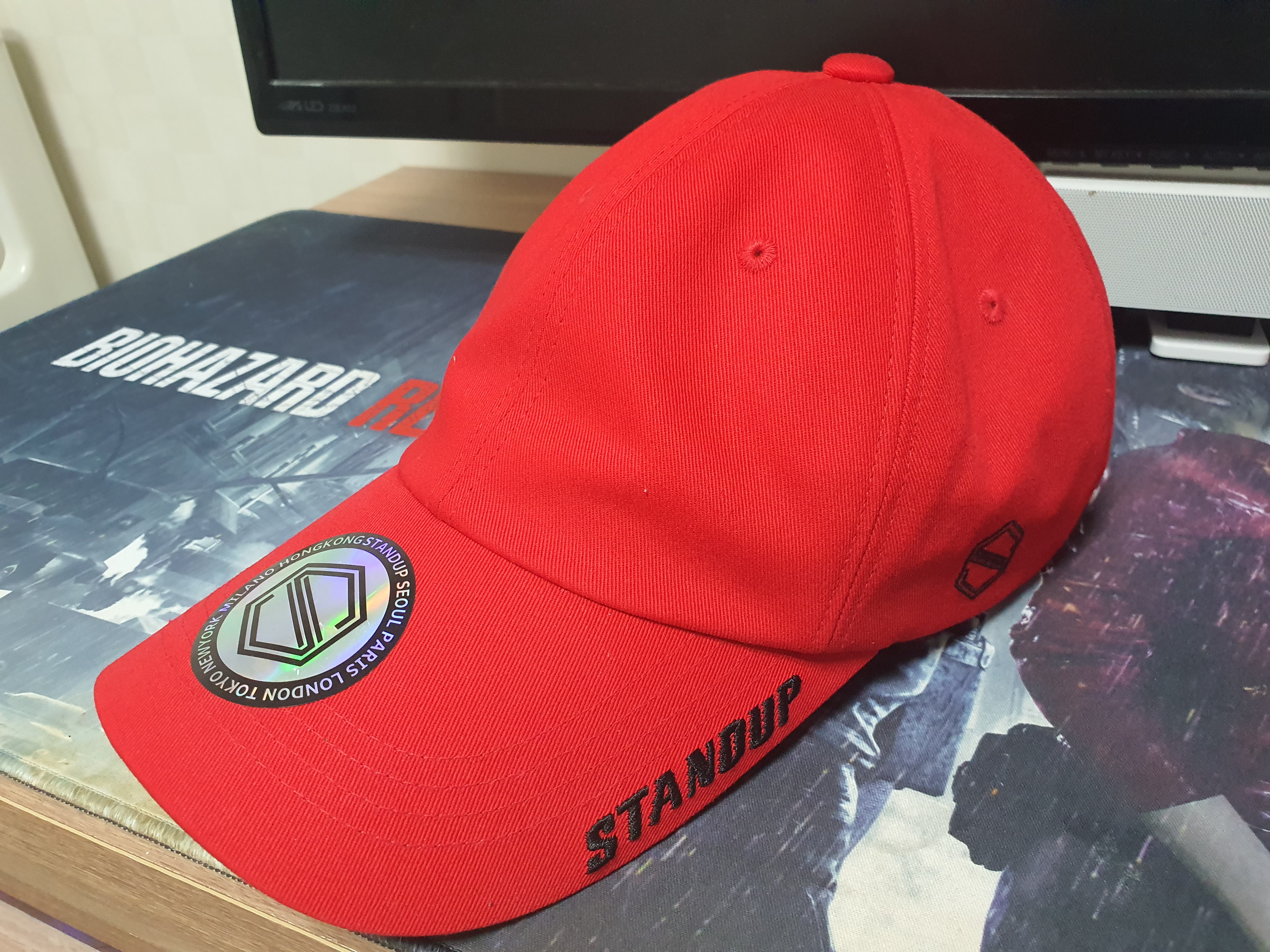 빨간 모자에 스탠드업 검정글씨의 포인트가 모자의 매력을 한껏 더 살려주네요.