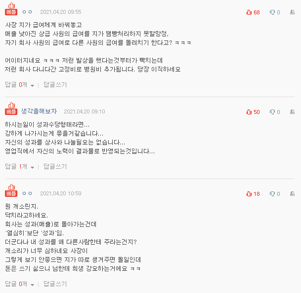 '일은 많이 하는데 실적이 얼마 안되서 급여가 너보다도 적다.