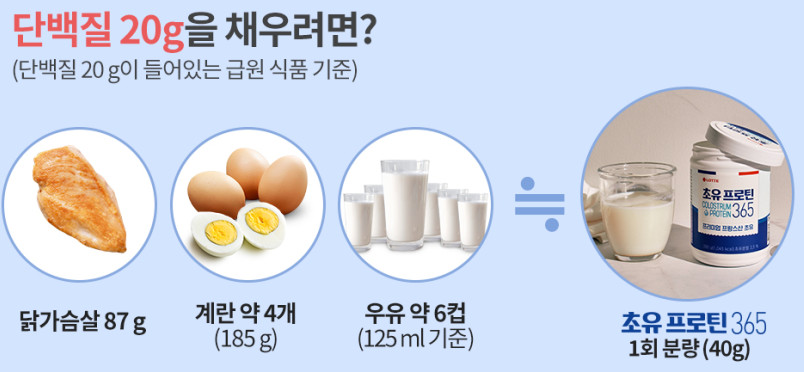 초유 프로틴365는 1회(40g) 만으로도 단백질 20g 섭취가 가능한데요