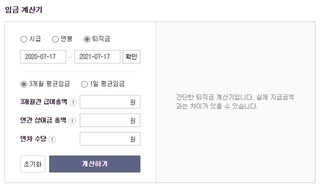 다음 포털 사이트에서 검색창에 퇴직금 계산방법을 검색하시면 임금 계산기가 나옵니다.