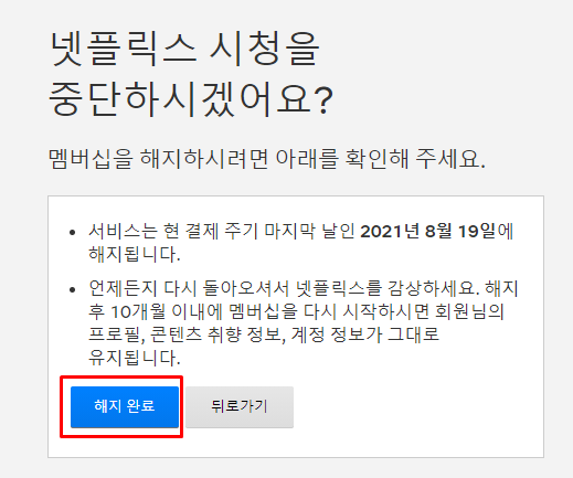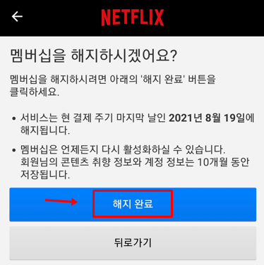 이 메뉴창에서 해지완료를 터치하게 되면 넷플릭스 해지완료가 됩니다.