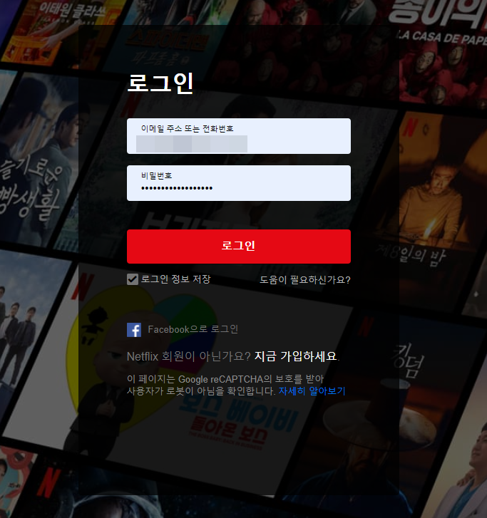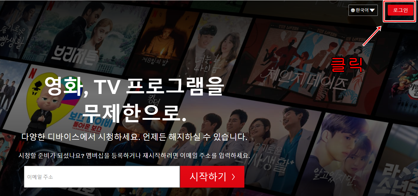 넷플릭스 공식 홈페이지로 들어가시면 위에 같이 첫화면이 나옵니다.