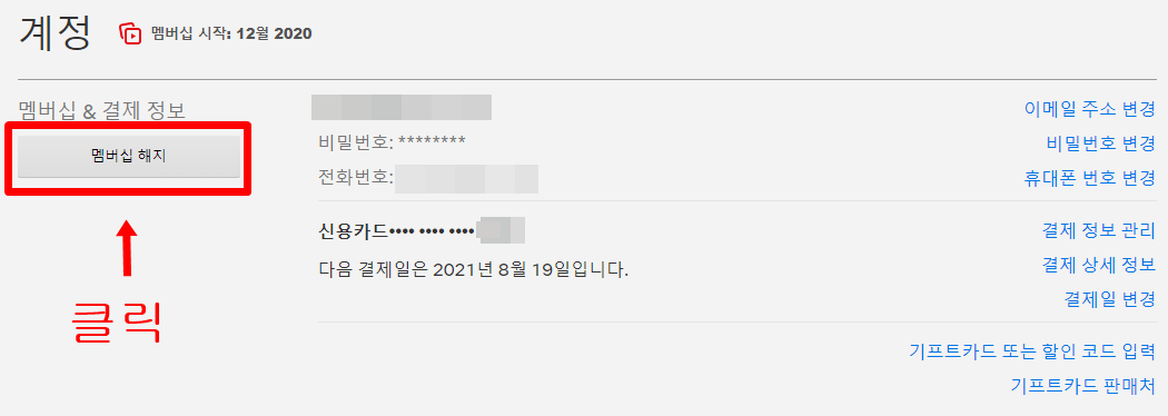 바로 밑에 멤버십 해지 버튼이 있습니다. 눌러주세요.