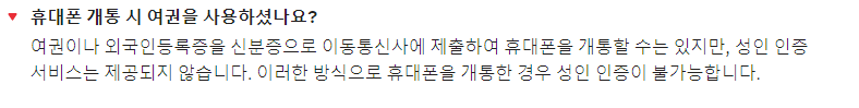 휴대폰 개통시 보통은 주민등록증 혹은 운전면허증으로 사용하는데 혹여 여권이나 외국인등록증으로 개통한 경우가 있습니다. 이러한 케이스는 연령인증(성인인증) 서비스가 제공되지 않는다고 합니다. 여권 혹은 외국인등록증으로 개통하신분들은 연령인증이 불가능하오니 다른분 계정 밑으로 들어가시는게 빠를듯합니다.