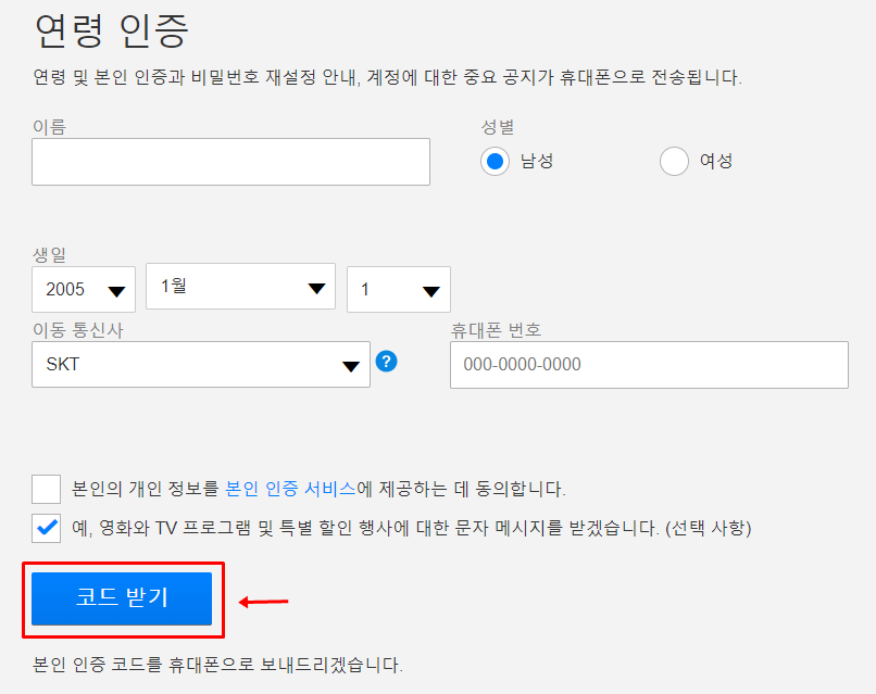 웹사이트에서나 어플을 통해 연령인증 요청을 받으면 문자로 위에 URL 주소가 포함되어서 오는데요. 클릭 혹은 터치를 통해서 접속하신 다음 계정 로그인 후에 위에 적어야 할 항목들을 순서대로 작성해주시고 코드받기를 눌러주세요. 본인의 스마트폰으로 인증코드 6자리가 오는데 그대로 입력하시면 연령인증이 완료됩니다.