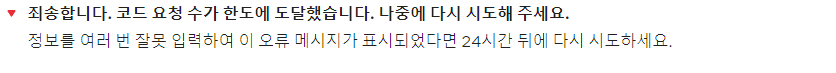 인증코드를 정확하게 기입하지 않고 여러번 잘못 오류기입해서 생기는 문제입니다. 이럴때는 계정보호를 위해 인증을 반복하지 못하게 락이 걸려버리는데요. 24시간 뒤에 풀리니 하루뒤에 인증을 다시 하시면 됩니다.