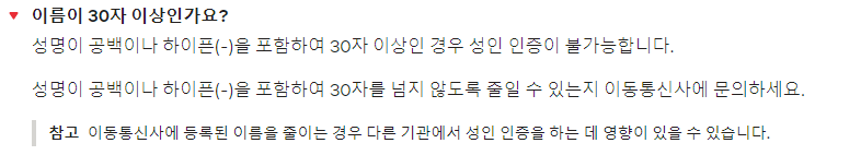 본인의 이름이 30자 이상일 경우에 인증이 불가능한데요. 우리나라에서는 절대 이런 케이스는 없으니 패스!