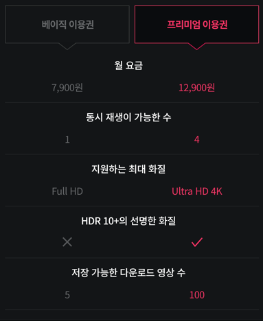 베이직 요금제는 7,900원이며 1인 혼자만 사용이 가능하며 지원하는 최대화질은 Full HD입니다. 부가적인 기능 HDR10+는 지원하지 않으며 저장 가능한 다운로드 영상수는 5개로 제한됩니다.
