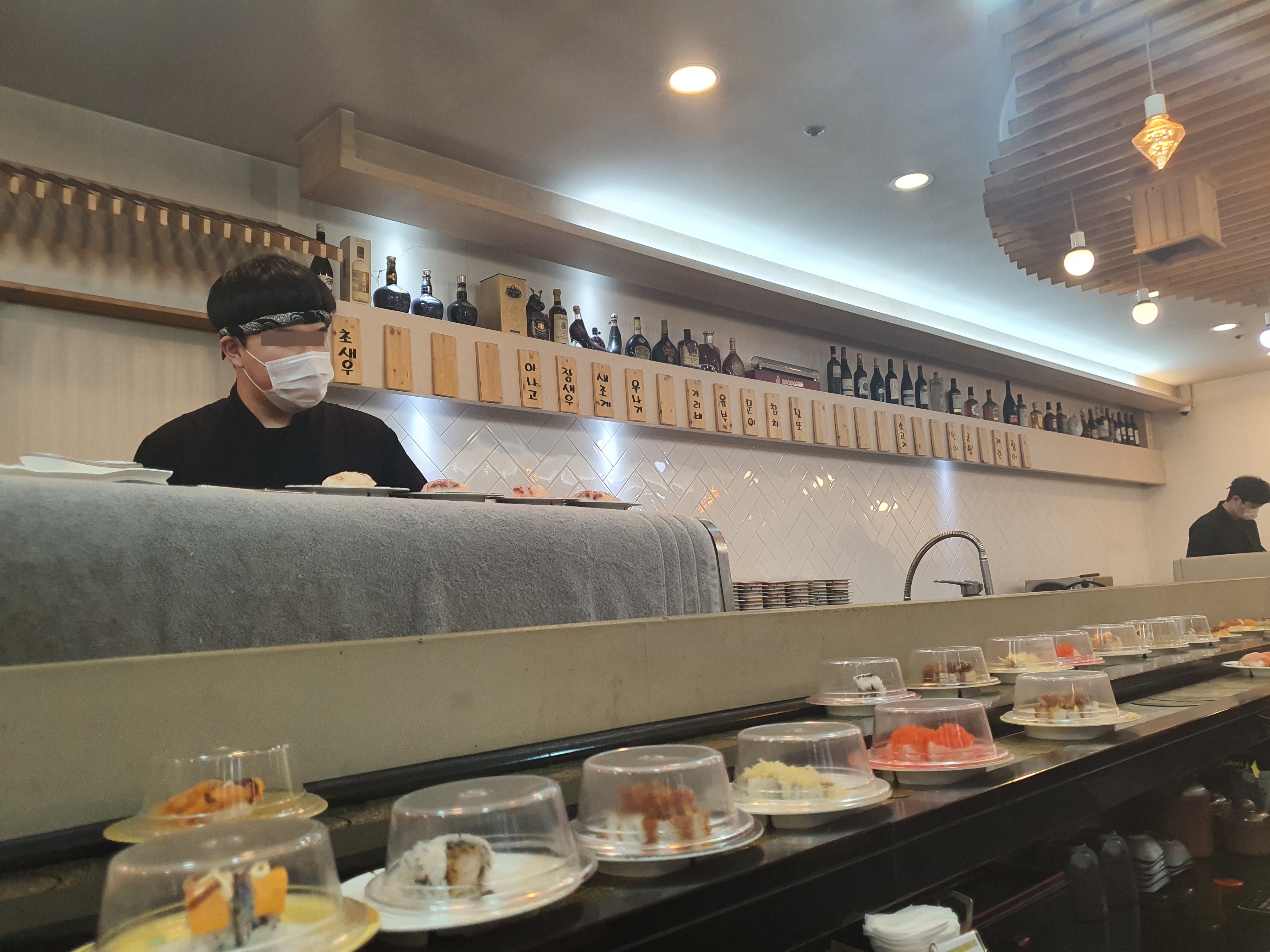 직원분인지 사장님인지는 모르겠으나 초밥 장인같은 느낌으로 열심히 만들어서 회전레일에 생선초밥을 올려주고 있습니다.