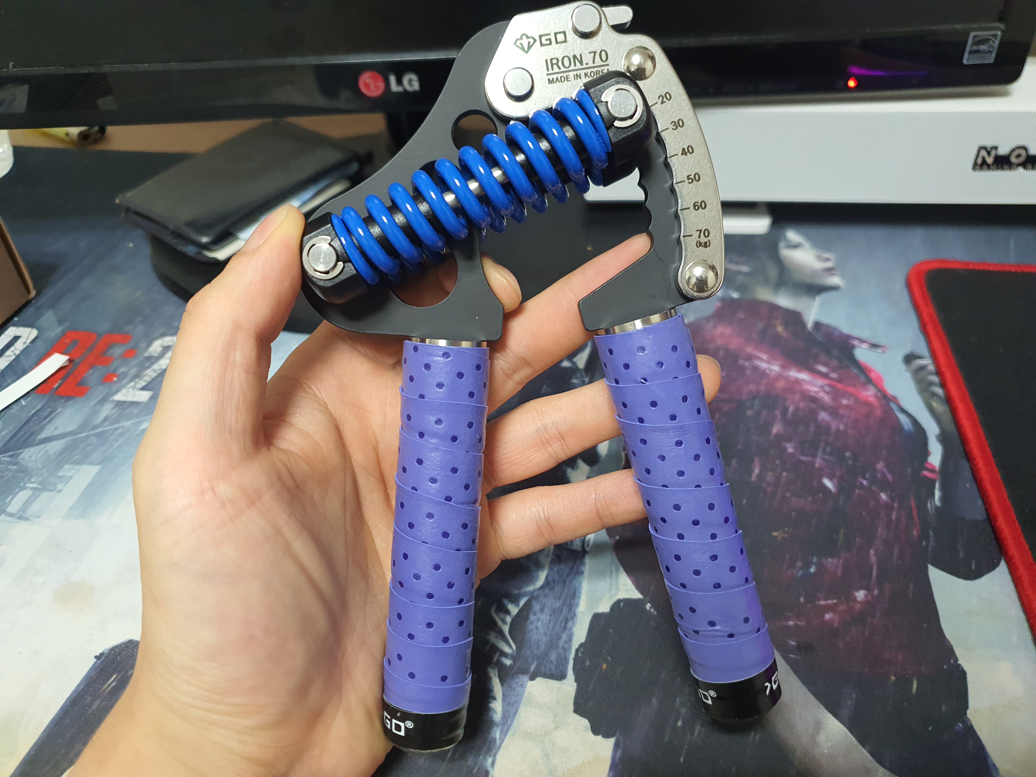 악력기를 하다보면 힘에 부쳐서 힘든것도 있지만 손바닥이 쓸리거나 눌려서 아파서 못하는 경우가 생기거든요. 그런걸 방지하기 위해 그립 테이프를 붙였는데 기능은 그렇다하더라도 디자인이 한껏 더 업그레이드 되었네요.