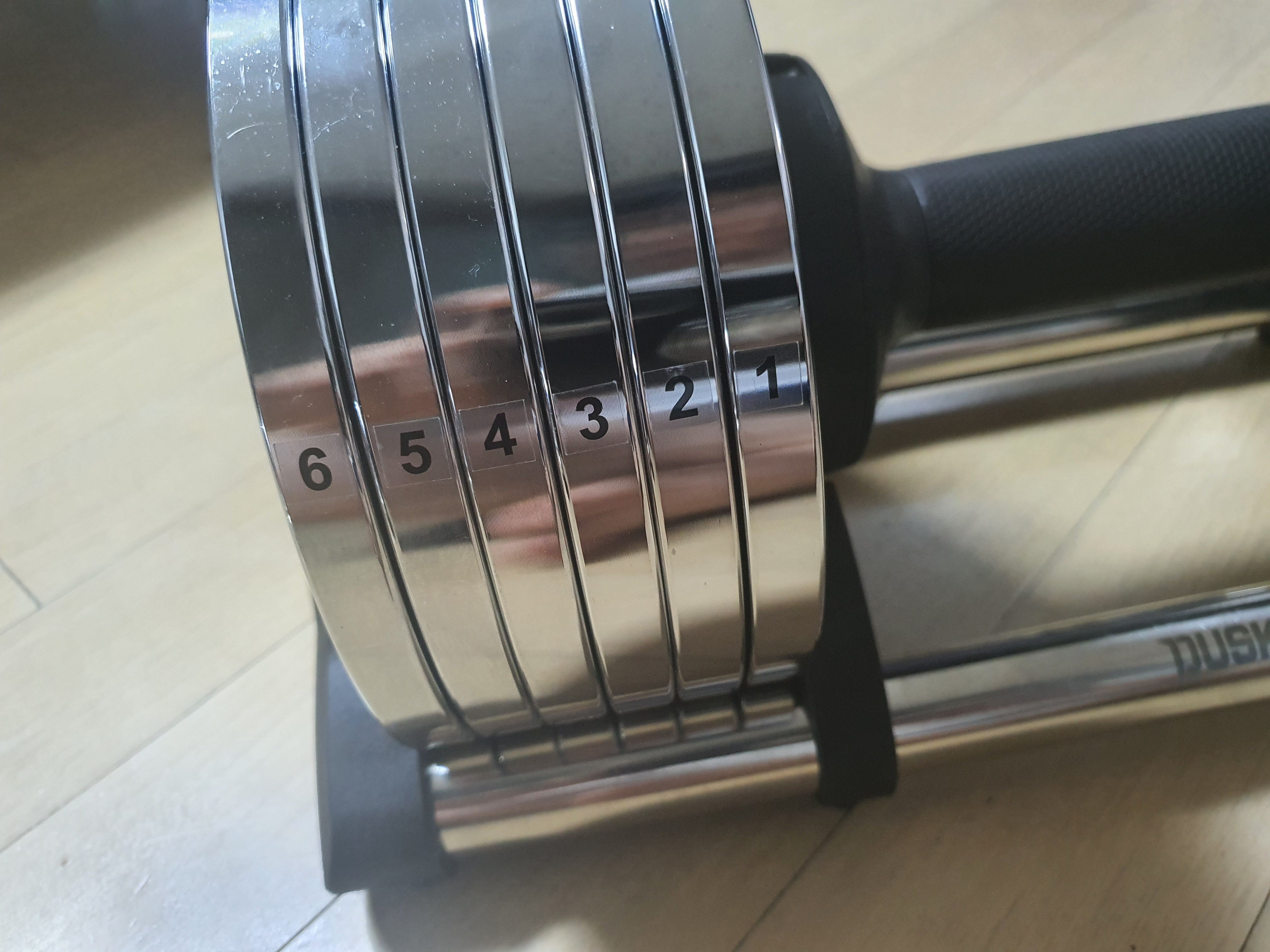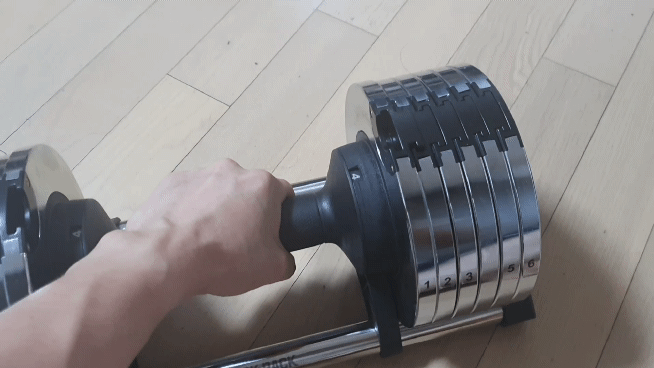 위에서 보여드렸듯이 다른 제품처럼 양쪽을 돌려서 맞추는게 아닌 중간 손잡이 부분을 돌려서 아주 부드럽게 무게조절을 할수 있습니다. 굉장히 손쉽고 빠르게 무게조절 변환이 가능하다는점이 더스크랙 크롬덤벨의 장점중에 하나입니다.