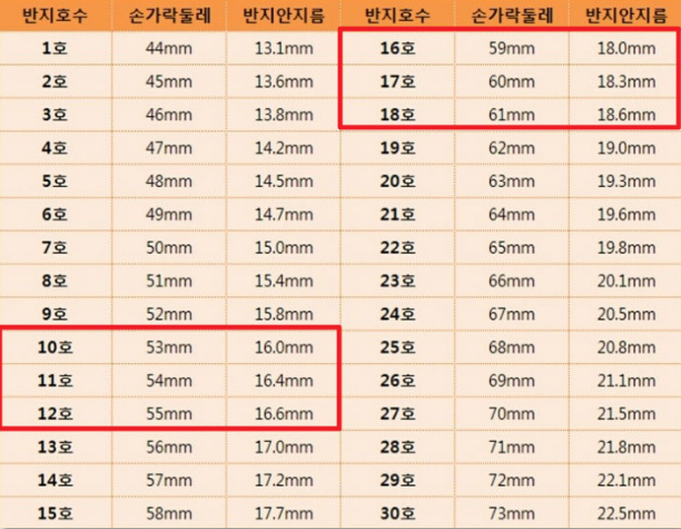 여자 평균 반지 호수는 10호~12호이고 남자 평균 반지 호수는 16호~18호 입니다.