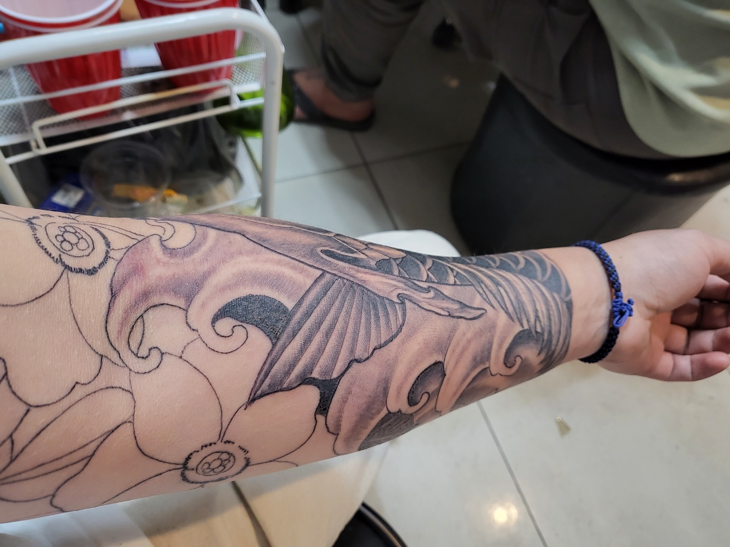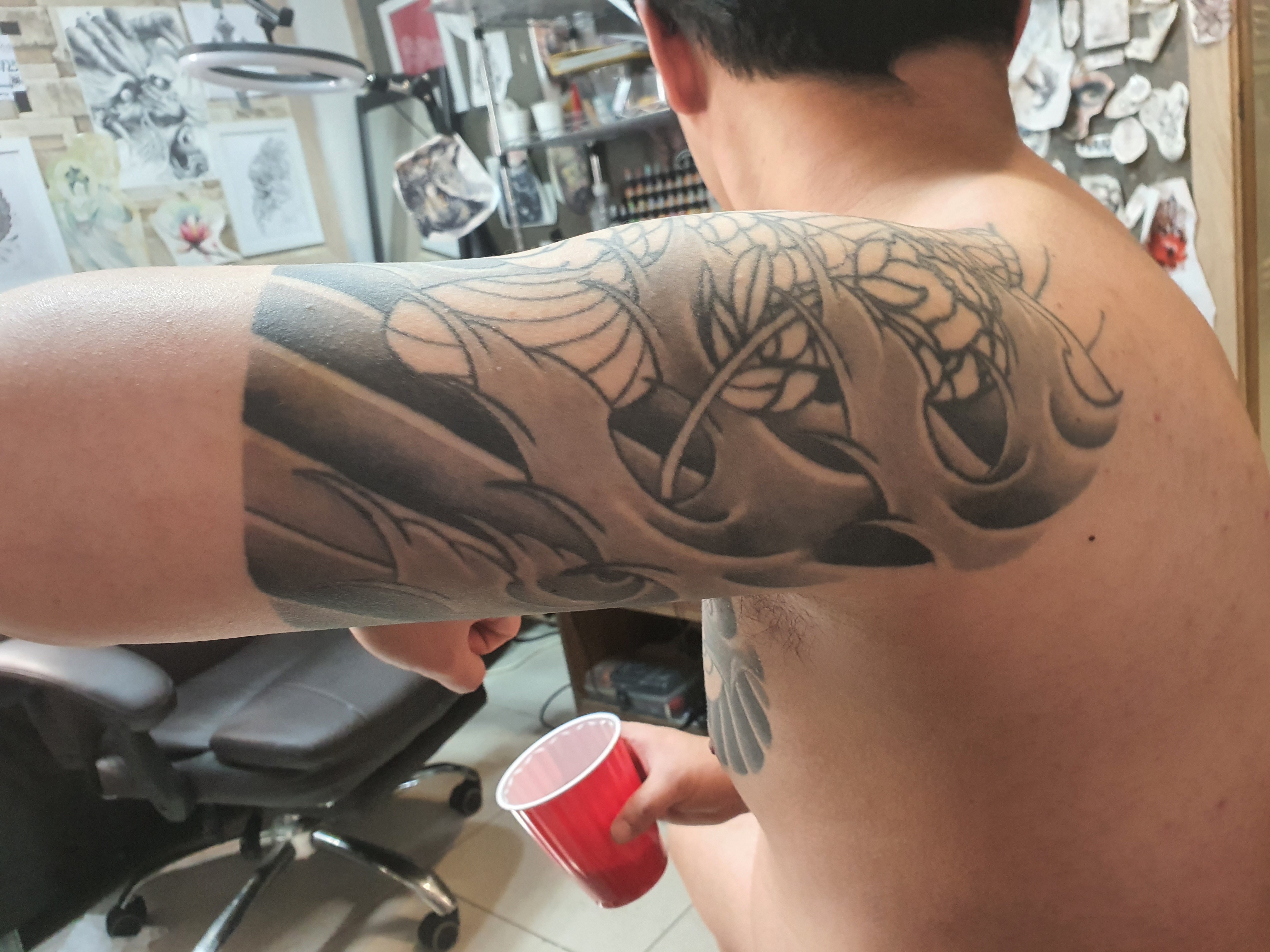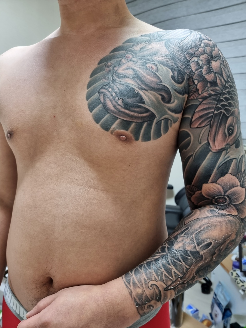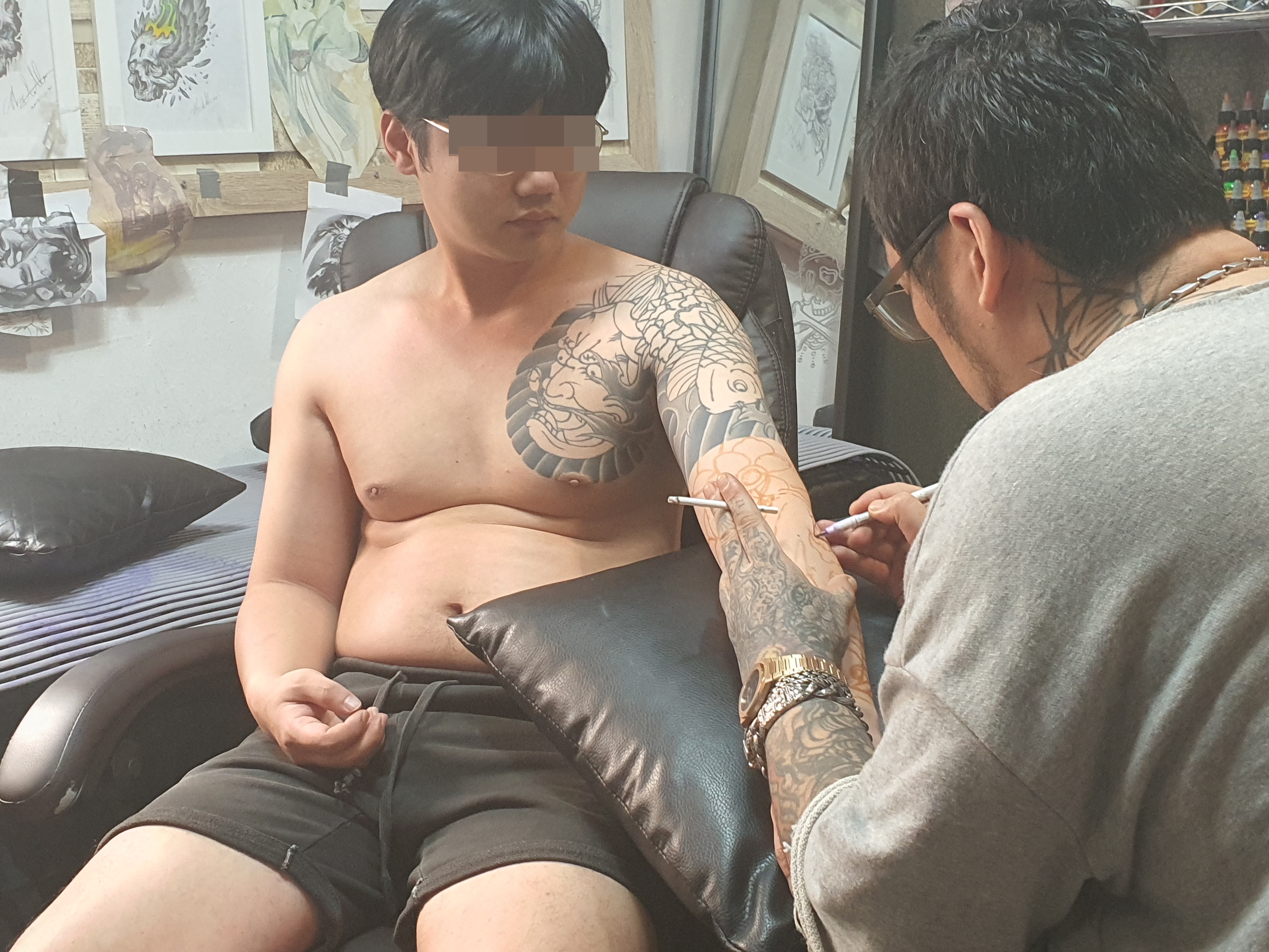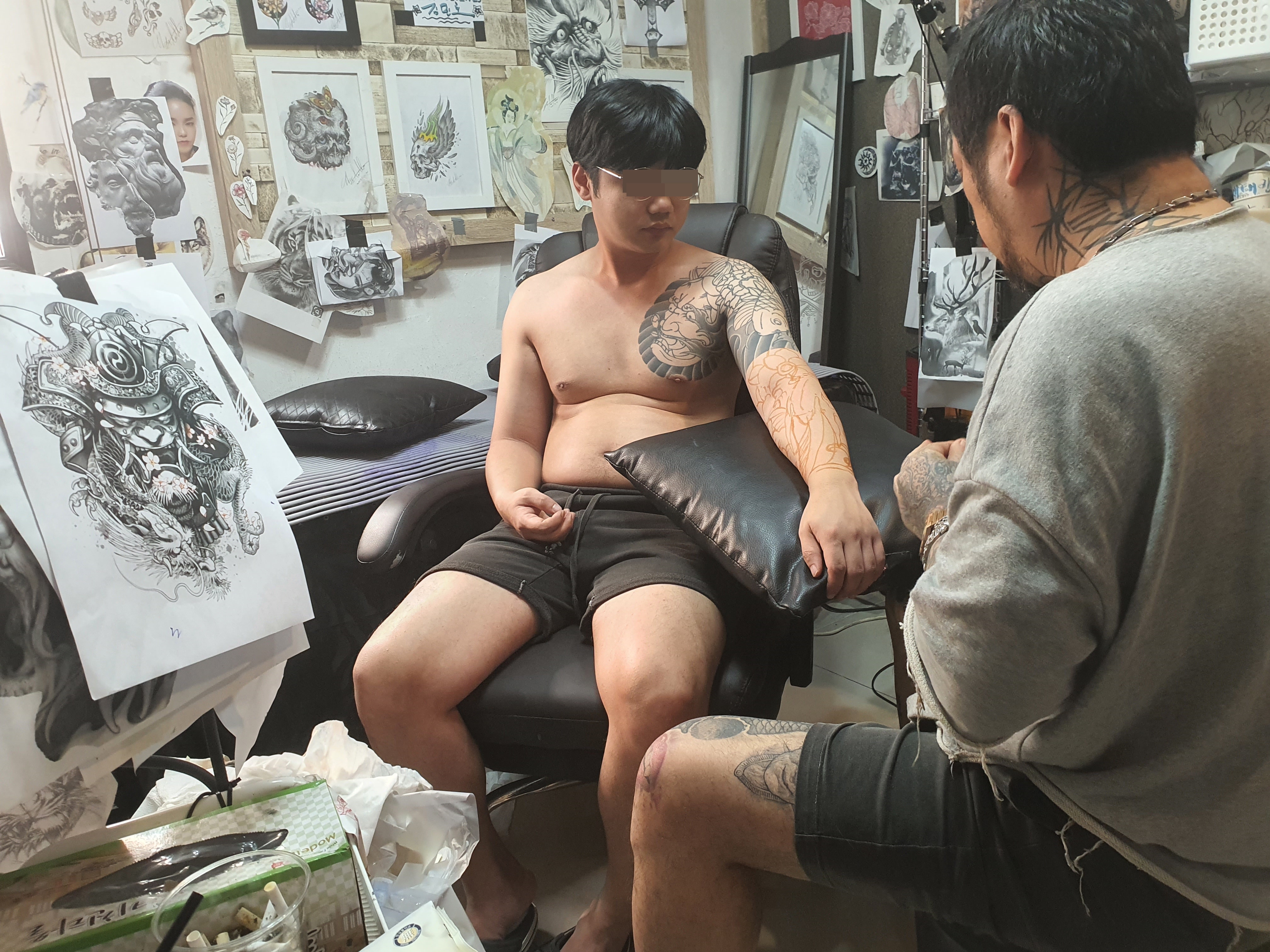 제친구는 기존에 있던 문신을 한층 더 업그레이드를 하면서 반팔까지만 있던 문신을 긴팔로 연장하는걸로 상담을 받고 서로 어떤 도안을 할건지에 대해 간단히 이야기하고 시술에 들어간 모습입니다.