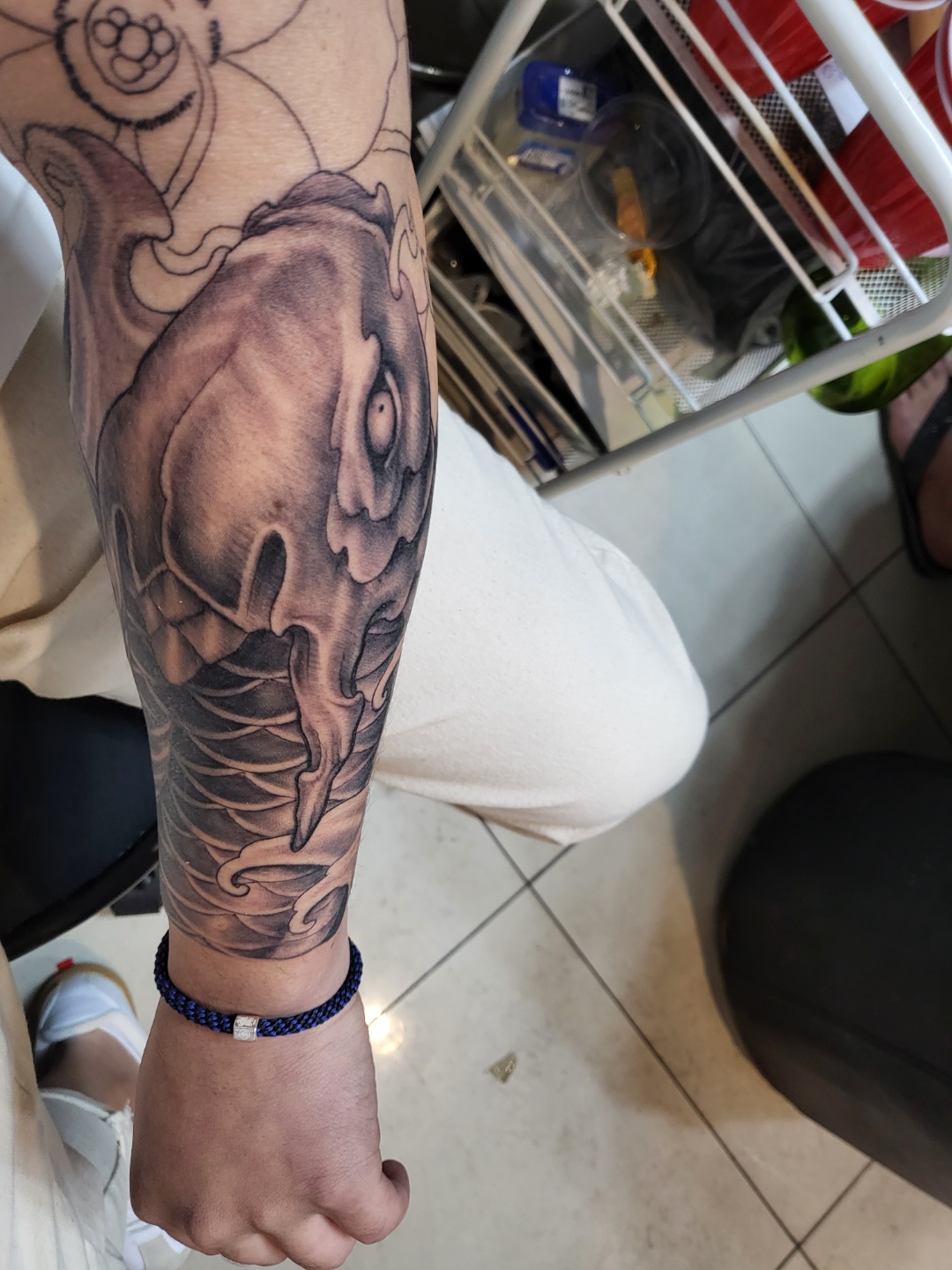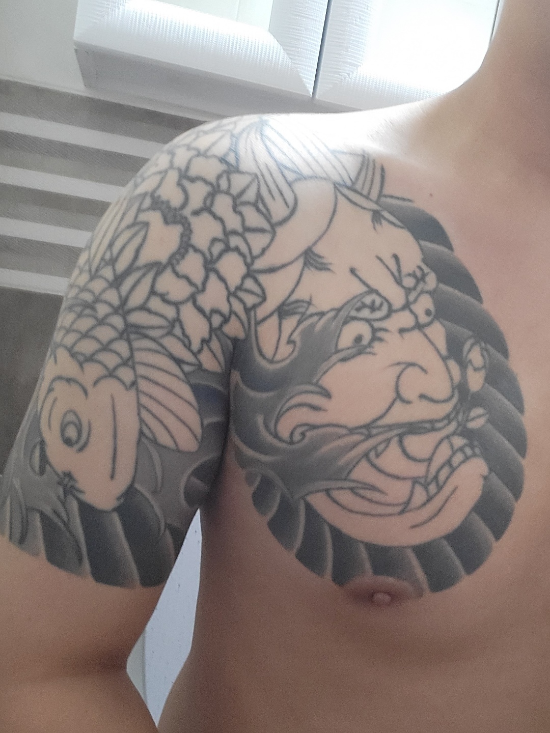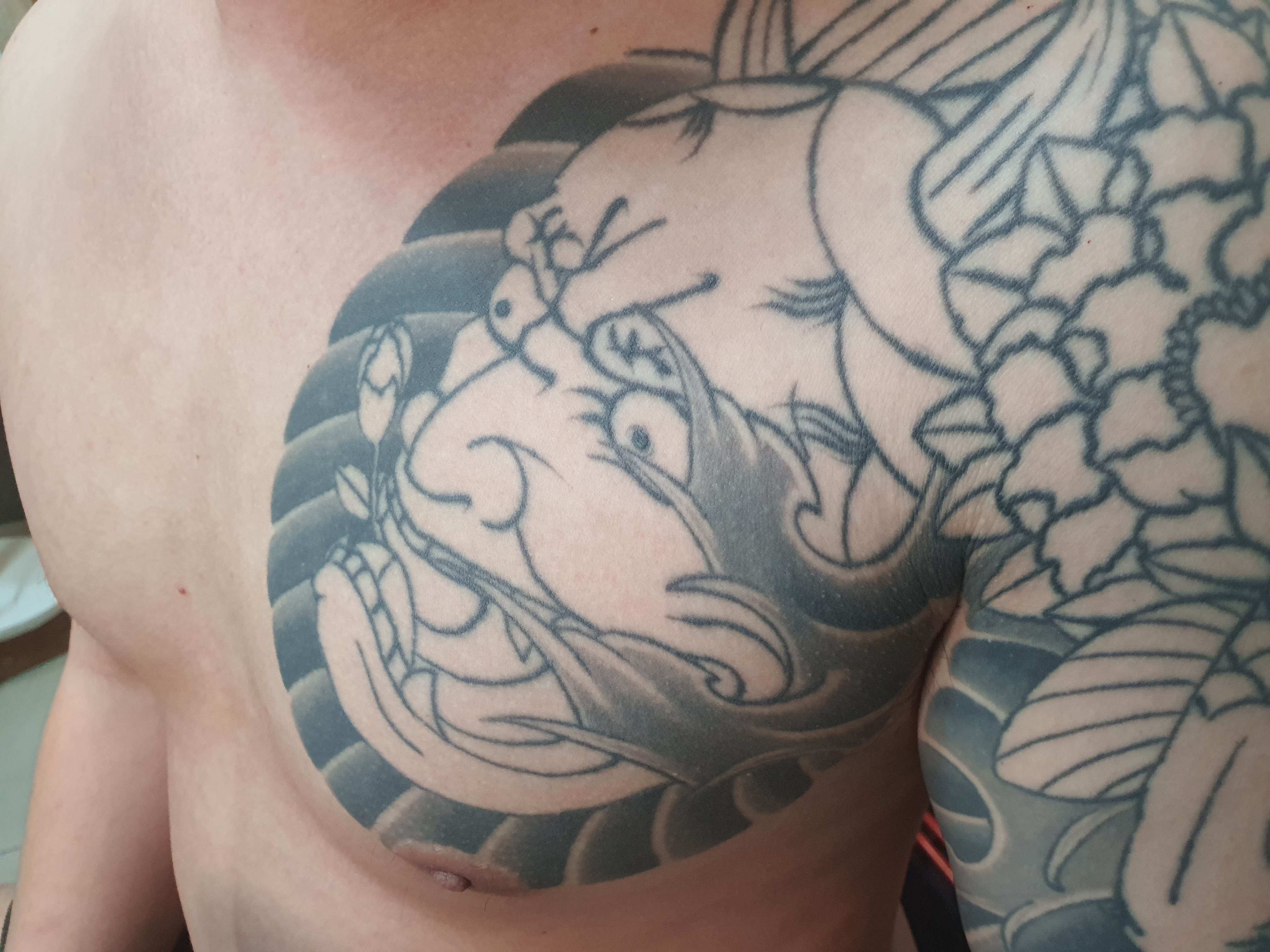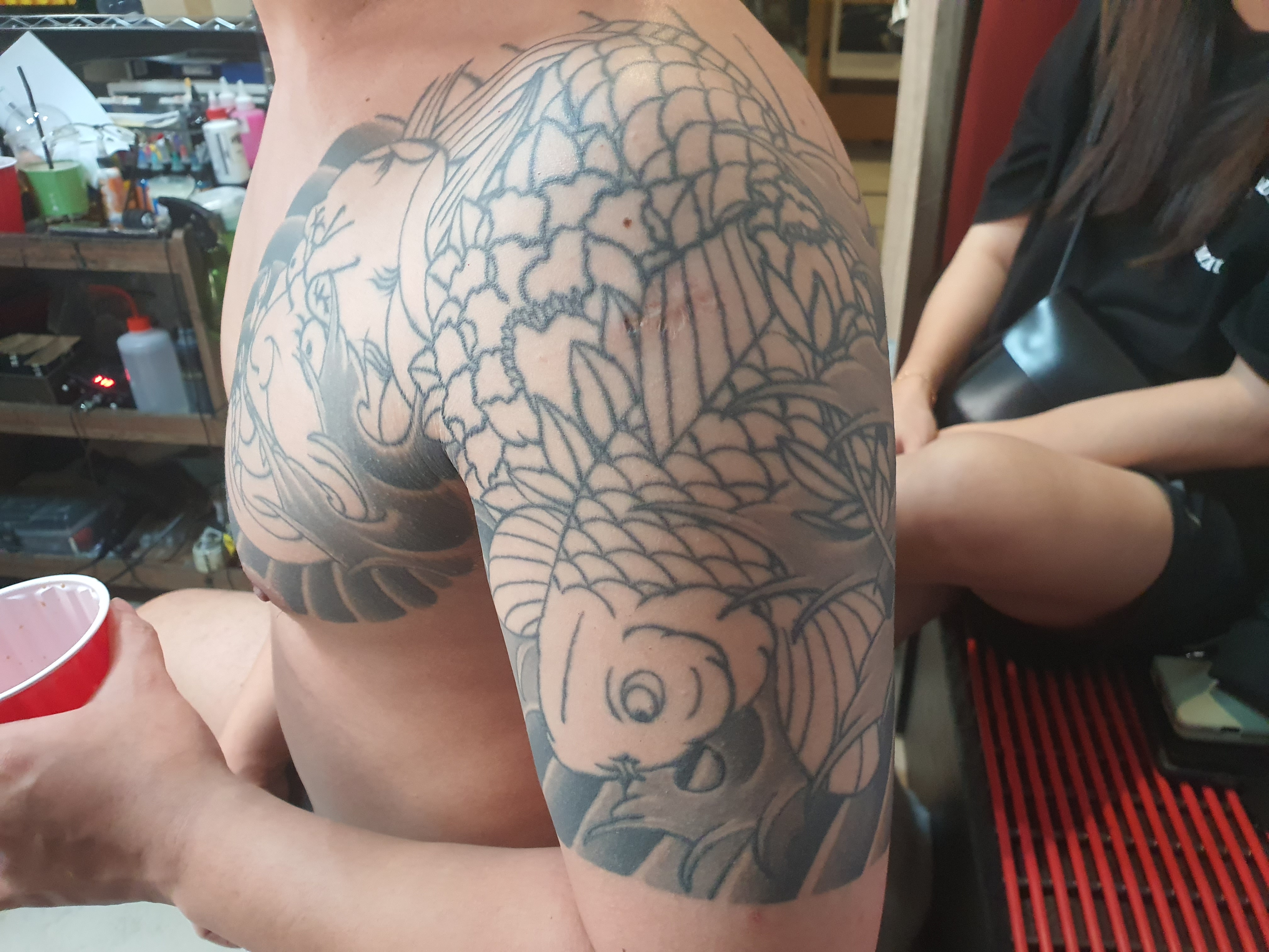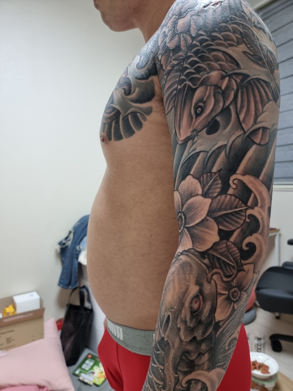 제친구는 기존에 있던 문신을 한층 더 업그레이드를 하면서 반팔까지만 있던 문신을 긴팔로 연장하는걸로 상담을 받고 서로 어떤 도안을 할건지에 대해 간단히 이야기하고 시술에 들어간 모습입니다.