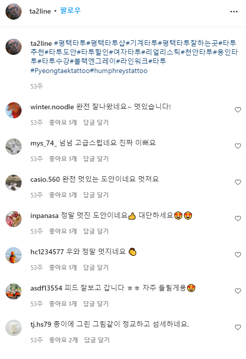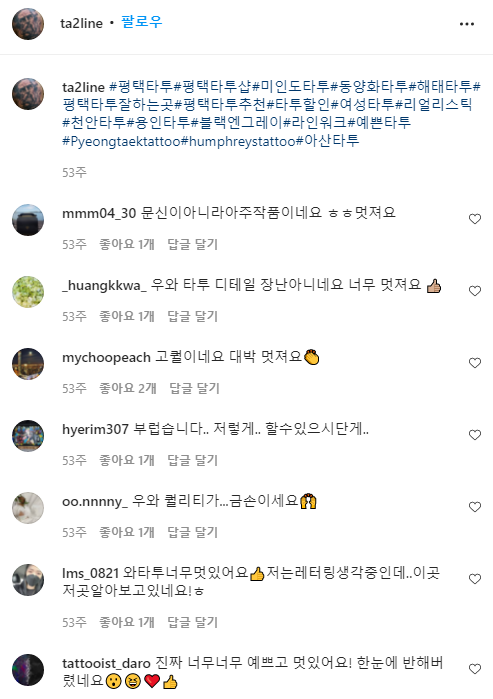 평택 타투라인 인스타를 들어가보면 시술했던 작품들을 올리시는데 사람들이 보고서는 댓글로 전부다 칭찬밖에 없을정도로 누가봐도 퀄리티가 뛰어나기 때문에 평택 타투라인이 유명한 이유입니다.