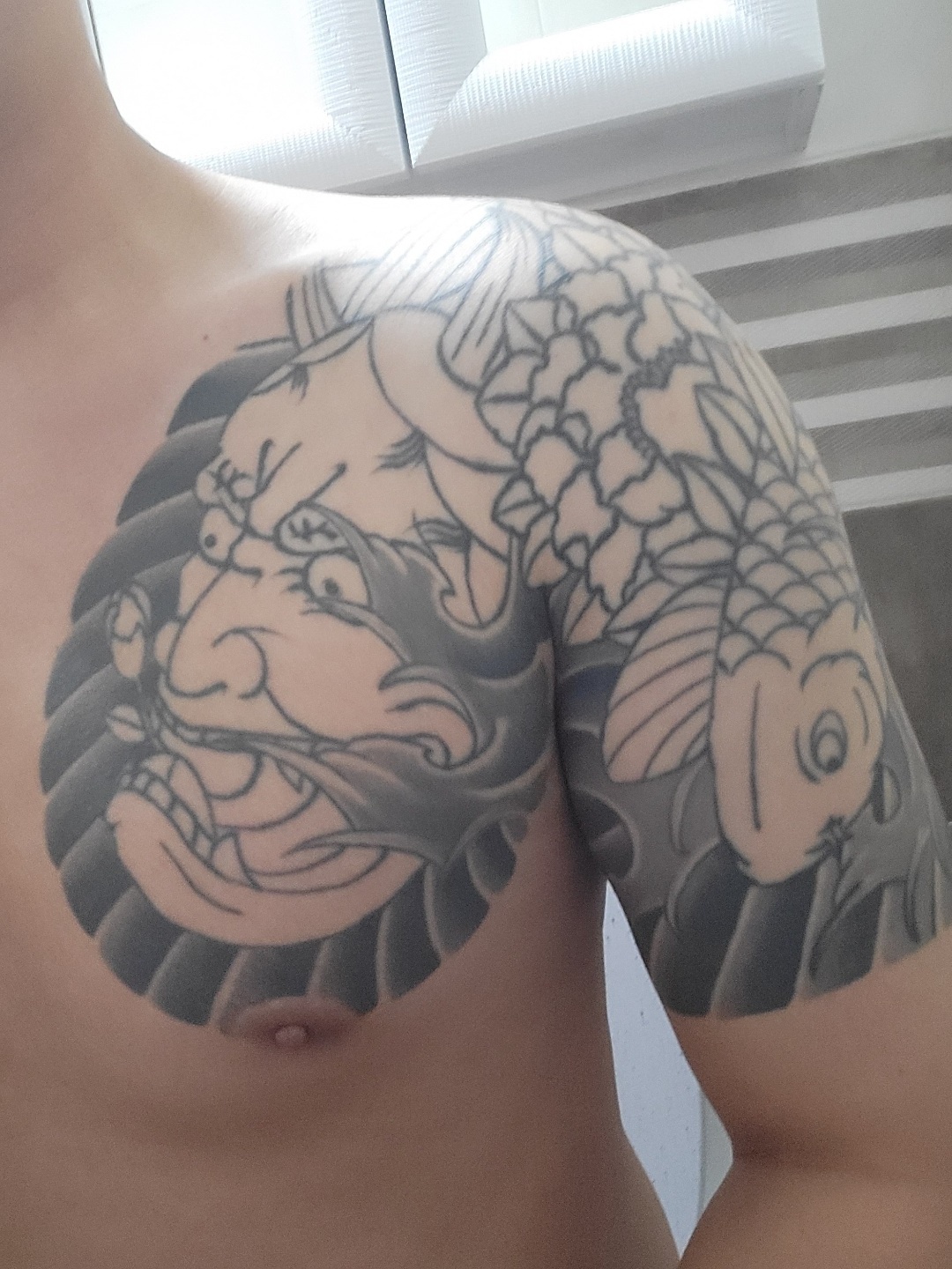 예전에 친구가 타투를 완성시키지 못하고 미완성 상태였는데 제가 한 문신을 보고 퀄리티에 반했는지 제가 했던곳을 추천 받아서 갔고 시술을 받기전 모습을 찍어봤습니다. 뭔가 조잡해보이고 라인도 굉장히 이상해 보이죠?