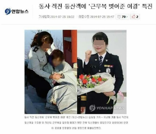 미화된 이야기를 인위적으로 만들고 의도적인 연출로 1계급 특진을 시키는 기사들을 보셨을겁니다. 위에 사진이 대표적인 사례인데요. 동사 직전 등산객에 근무복 벗어주는거? 실종 치매노인에 신발, 양말 벗어주는거? 경찰로써 당연한 행동입니다. 그게 무슨 나라를 구한것마냥 저런식으로 1계급 특진시켜준다는것 자체가 역차별이며 오히려 여자경찰(여경)에게 특혜를 주는거 아니겠습니까?