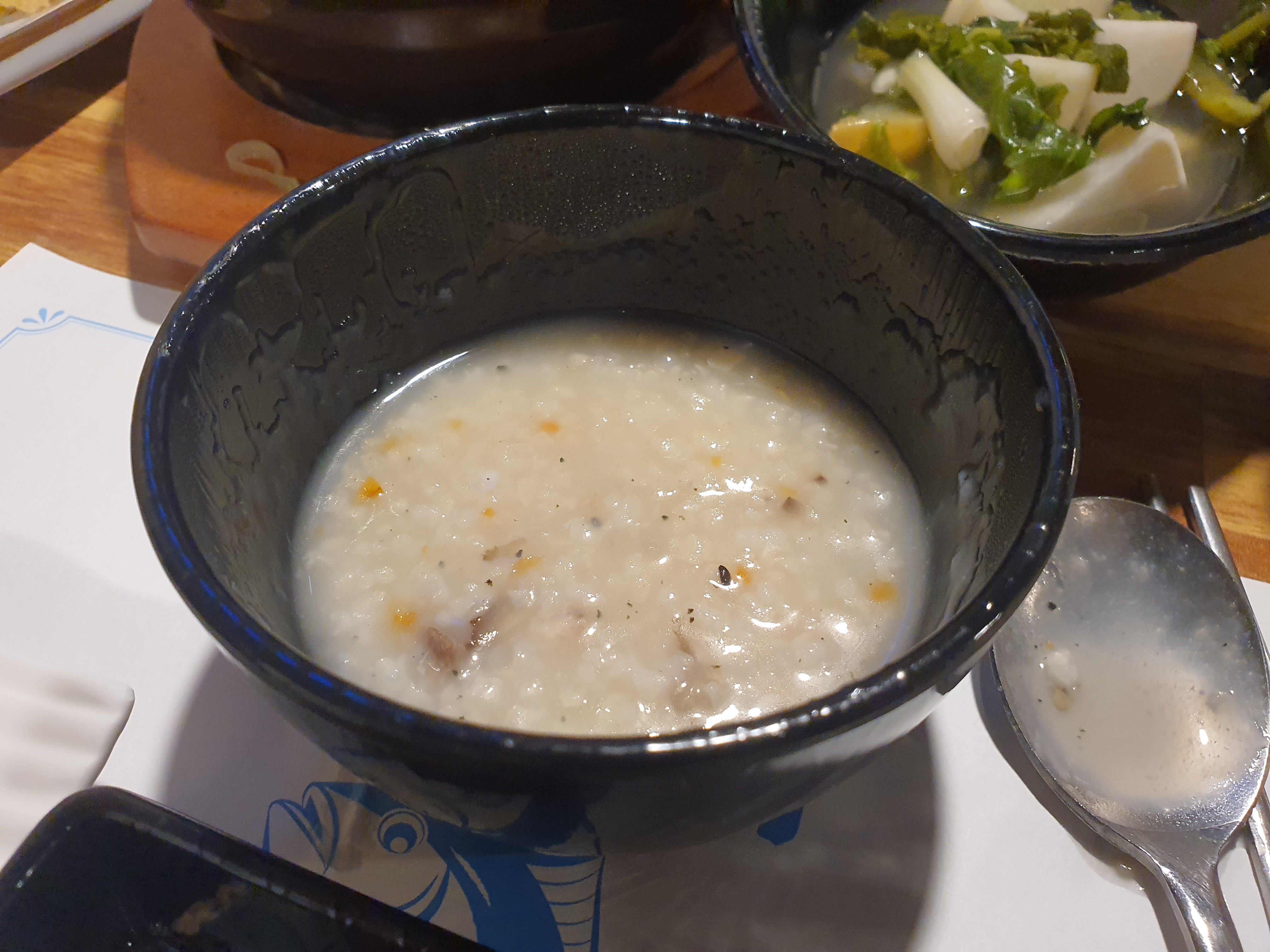 기본 반찬들이 나오면서 죽도 나오고 얼큰한 어묵탕도 제공이 되는데요.