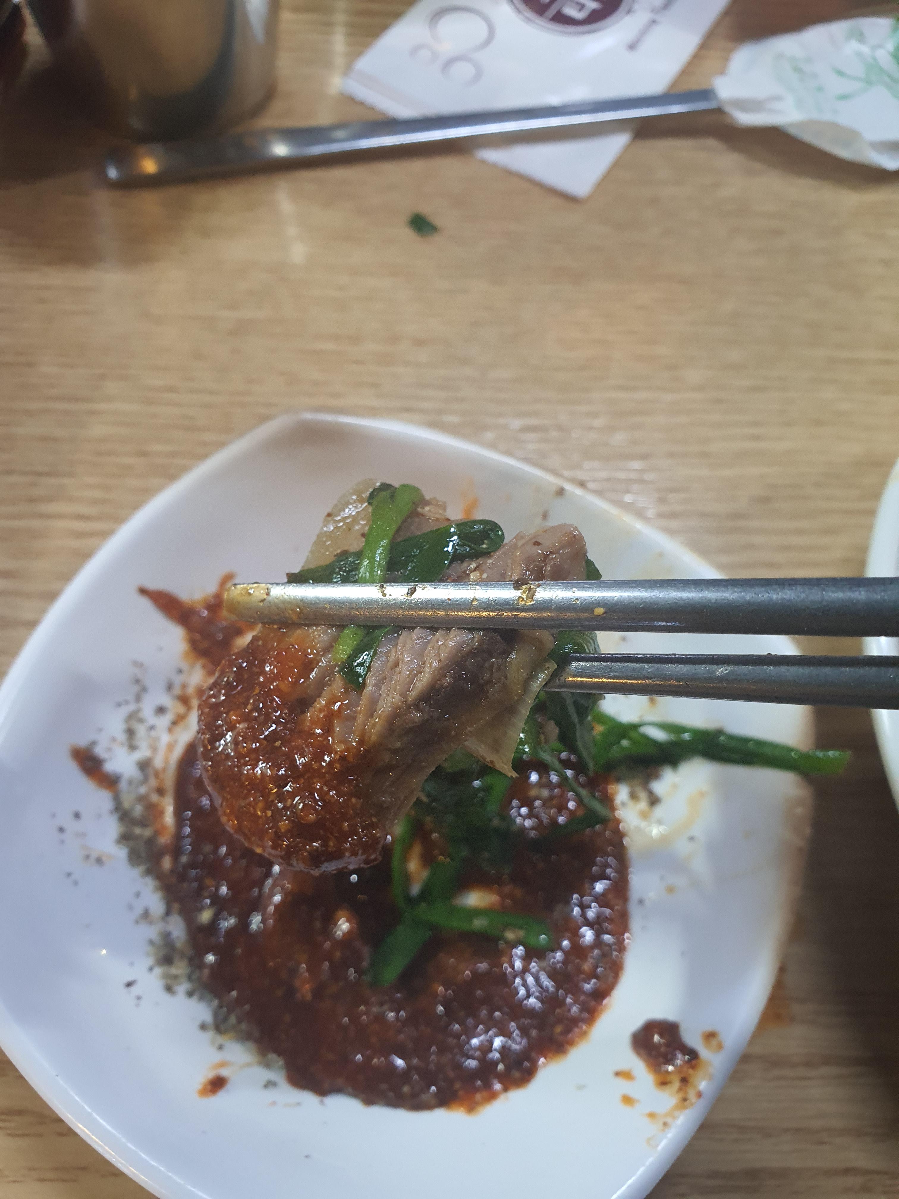 흑염소 고기를 양념장에 푹 찍어 제 입에 드디어 골인시켰습니다.