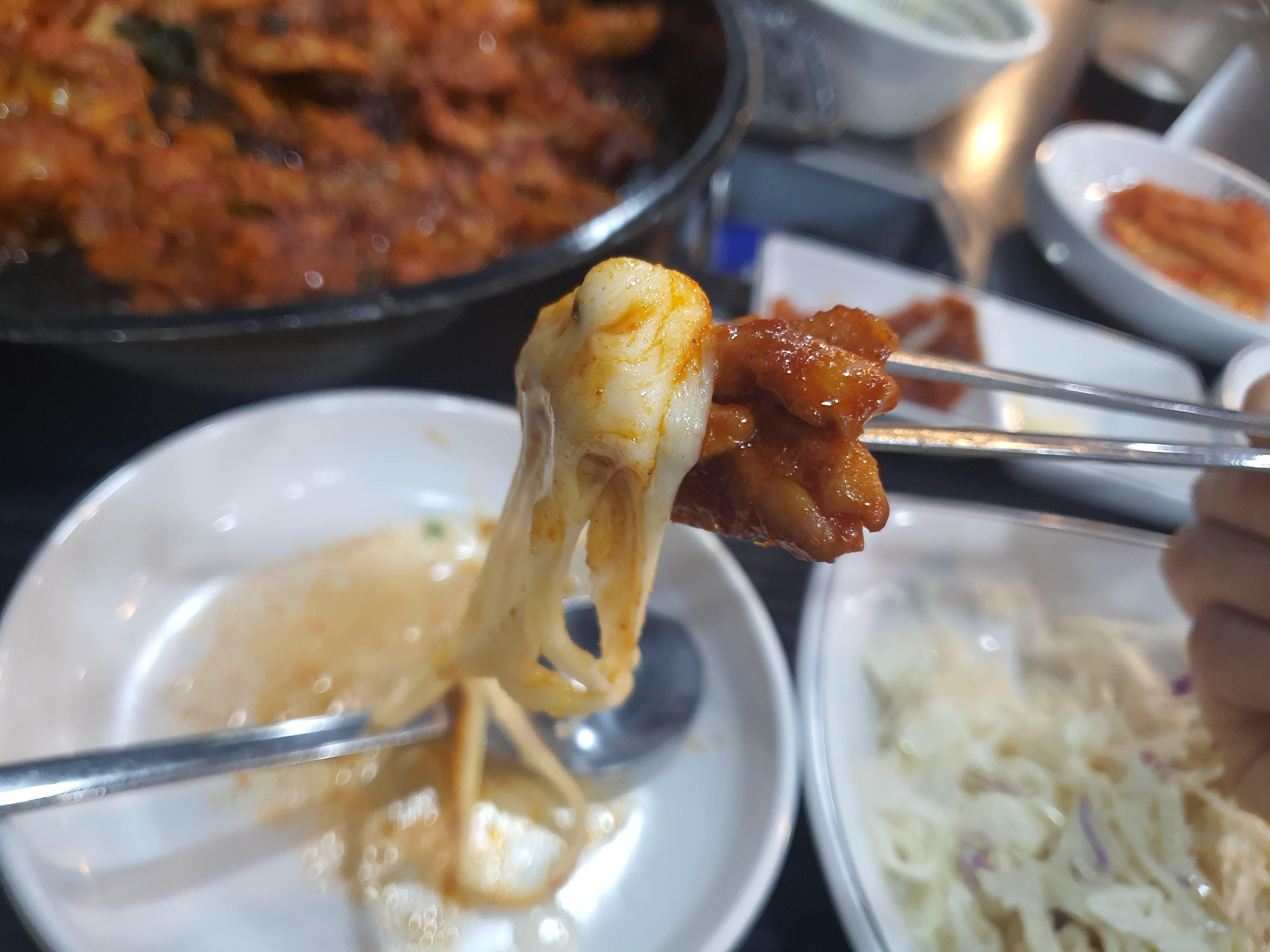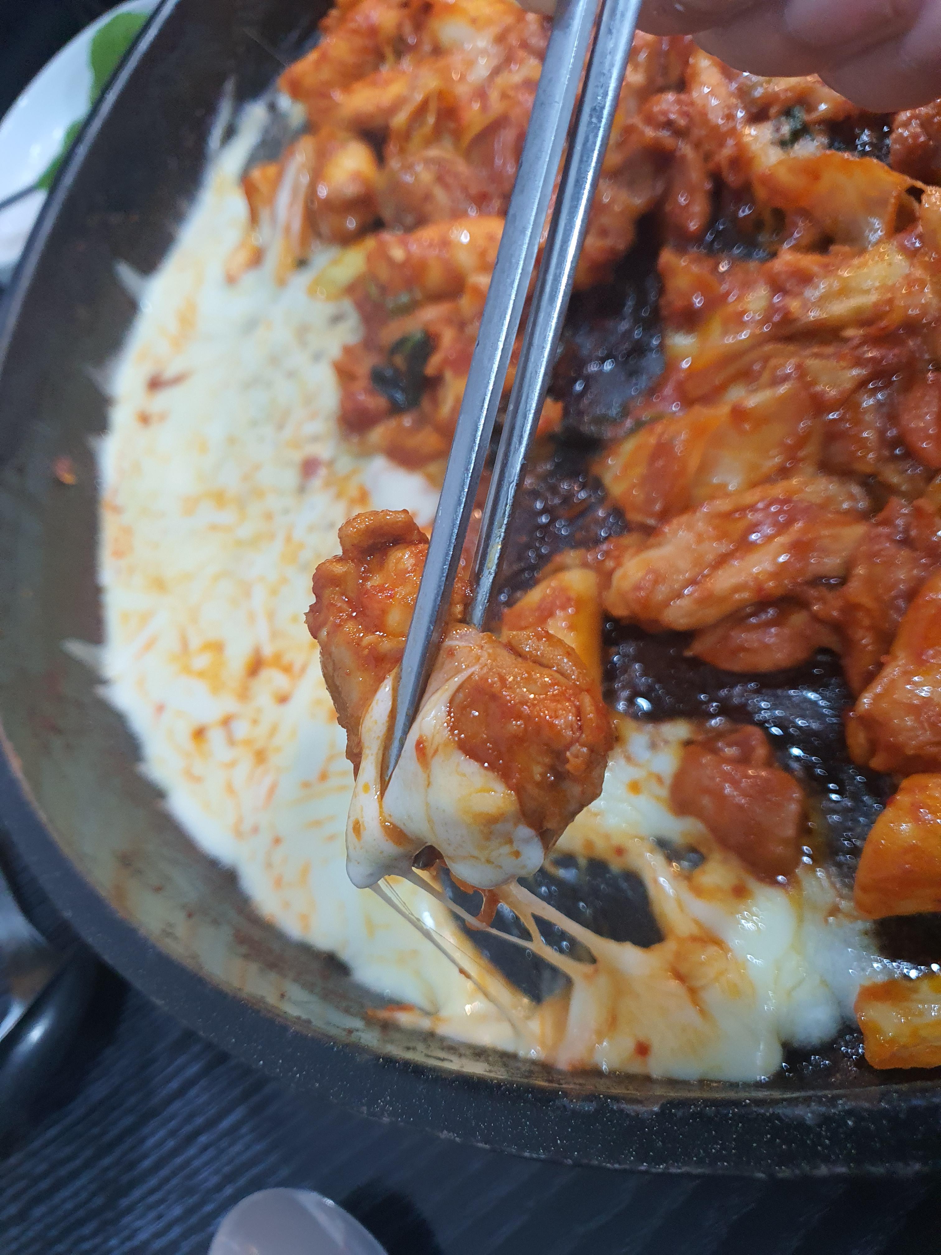 치즈사리에 닭갈비를 듬뿍 얹어서 먹으니 정말 맛있습니다.
