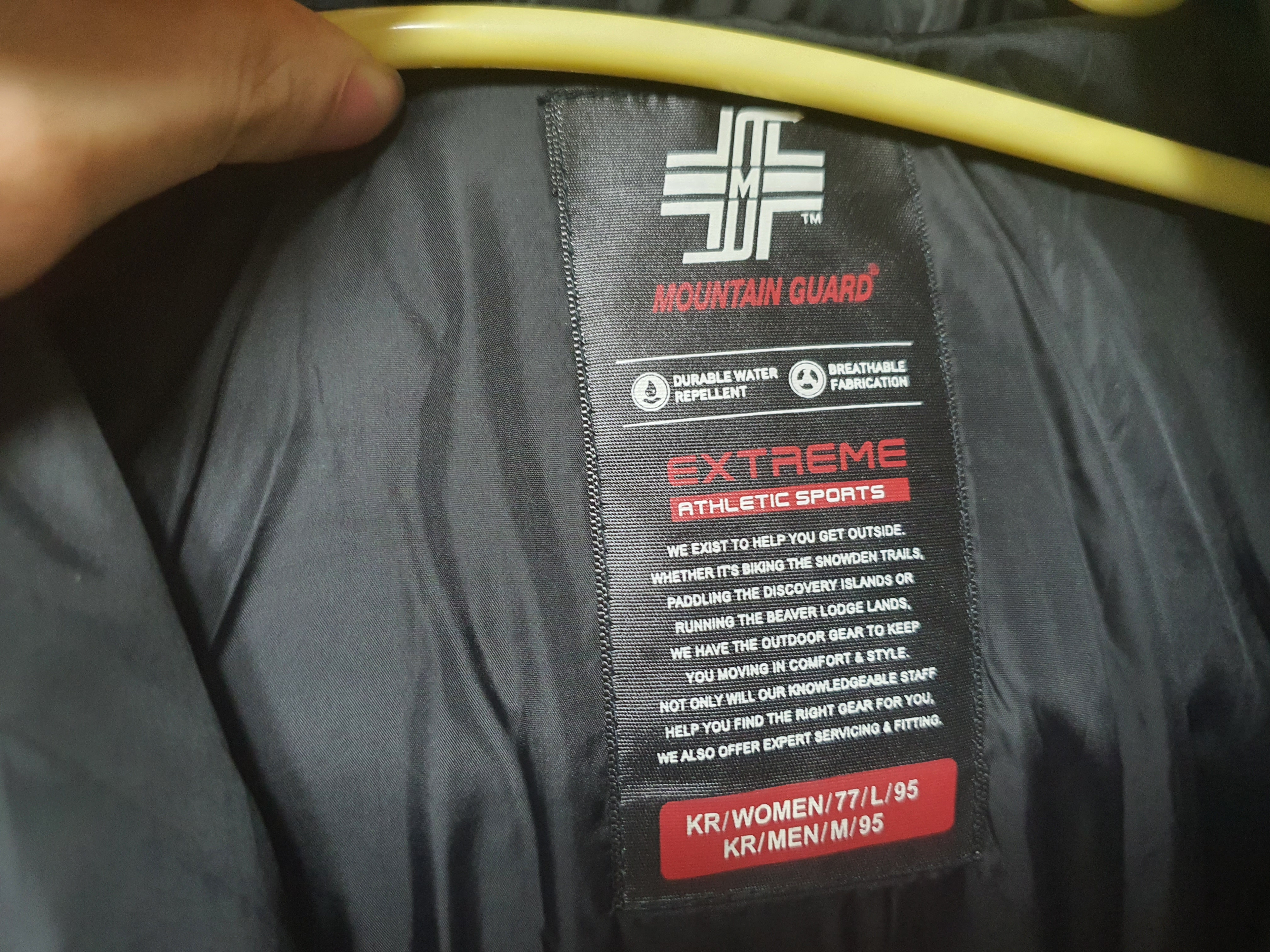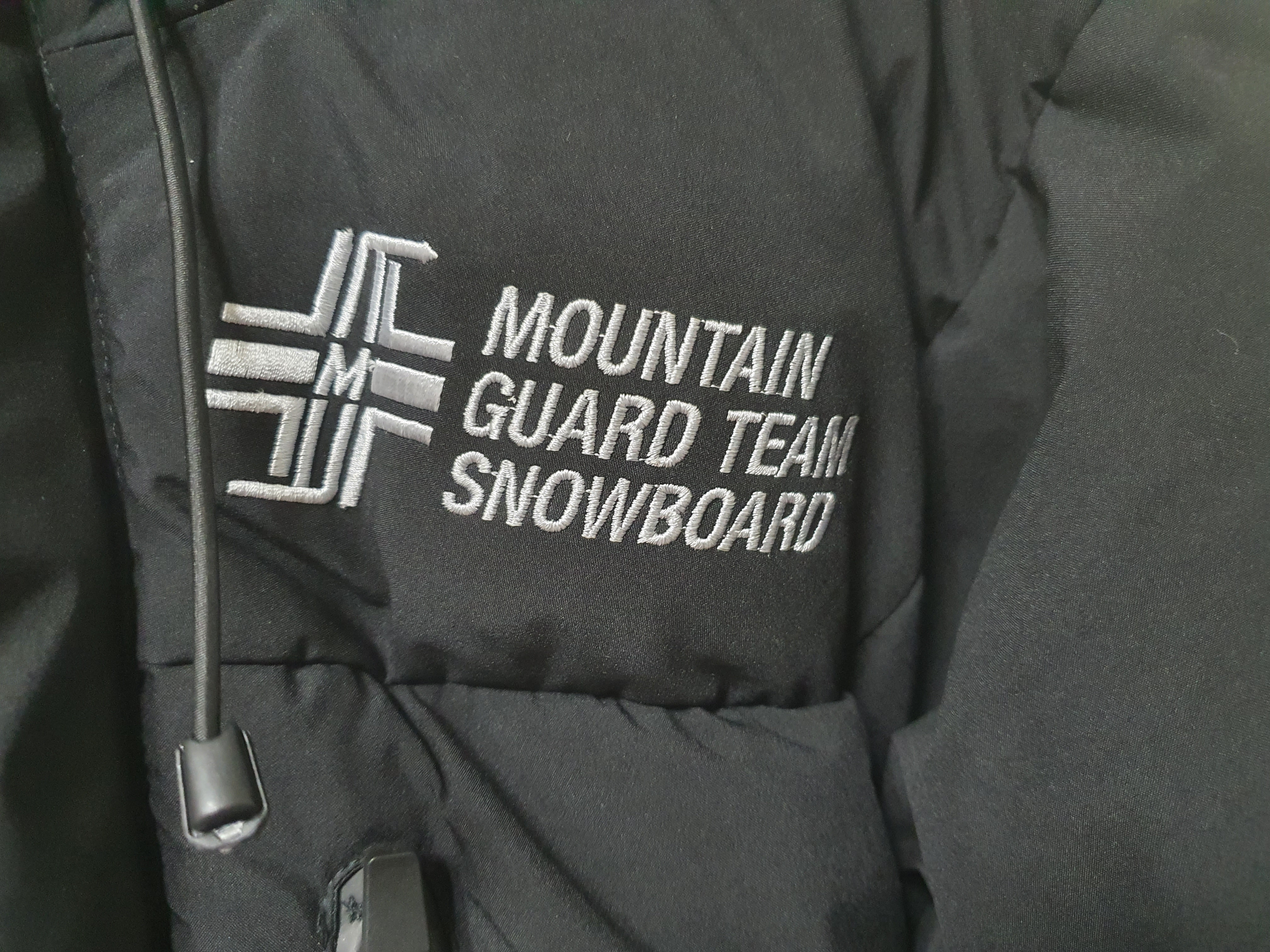 왼쪽팔 부위에는 높은 퀄리티의 마운틴가드 레터링 자수사 처리로 깔끔하고 퀄리티 있어 보입니다.