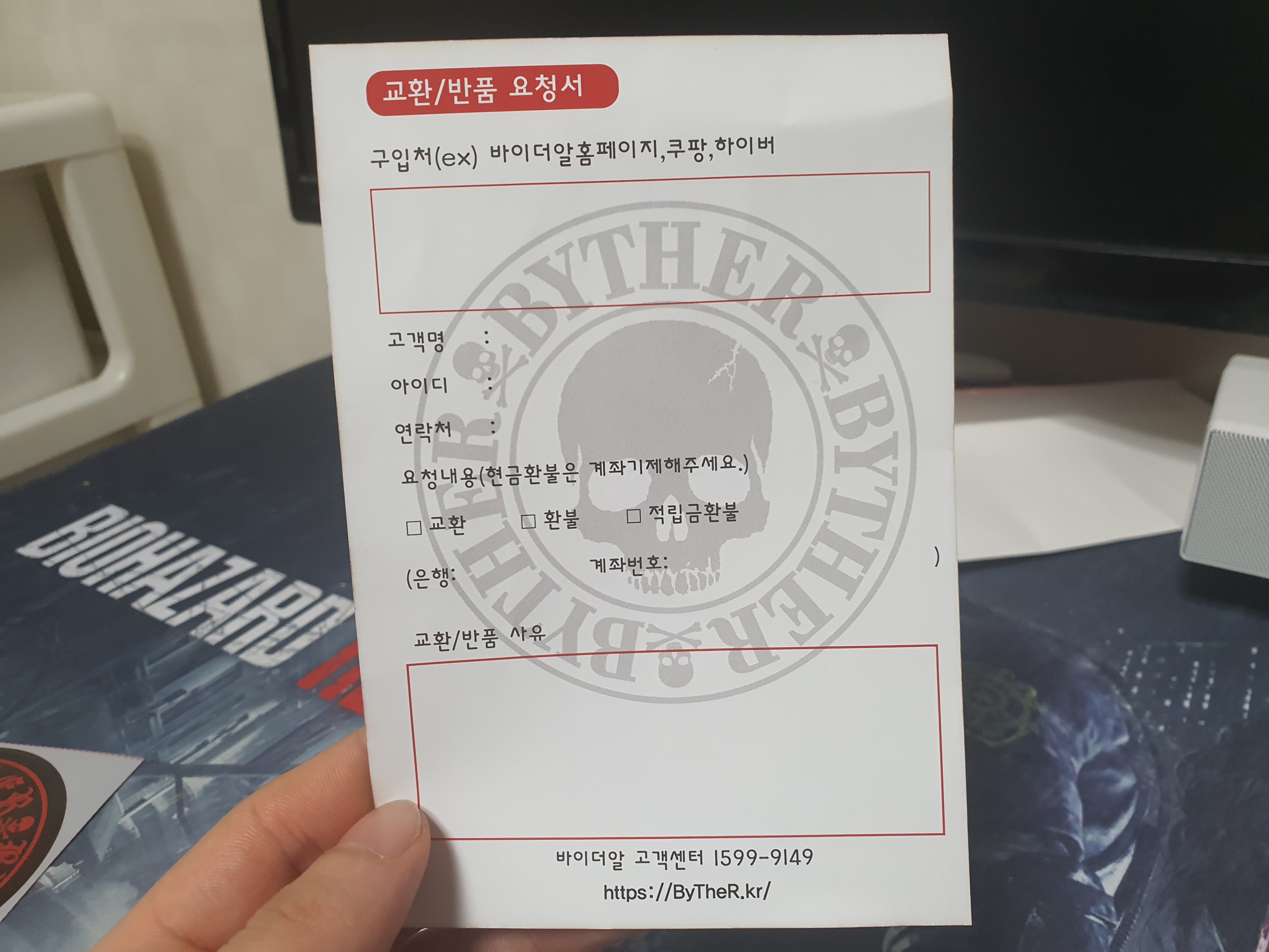패딩소개를 하기 앞서 같이 딸려온 봉투를 열어보니 바이더알 로고 스티커랑 특이한 컨셉을 찍은 사진(앞면)을 돌려보니 교환 및 반품 요청서(뒷면) 인데. 어짜피 교환 및 반품은 안할거고 스티커는 나중에 알맞은곳에 붙이려 합니다.