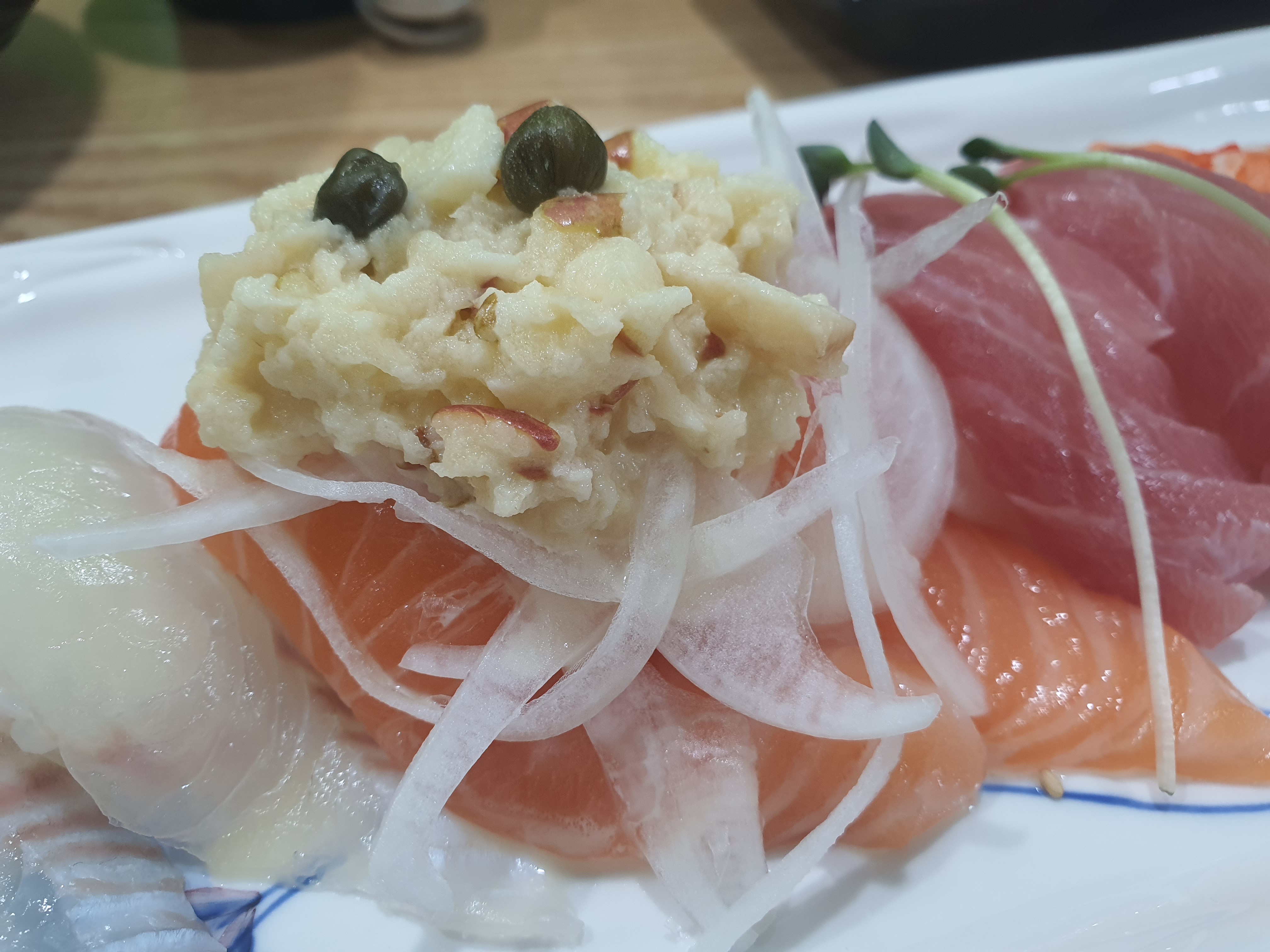 연어초밥 위에 양파에 으깬 사과를 얹어서 주는데요.