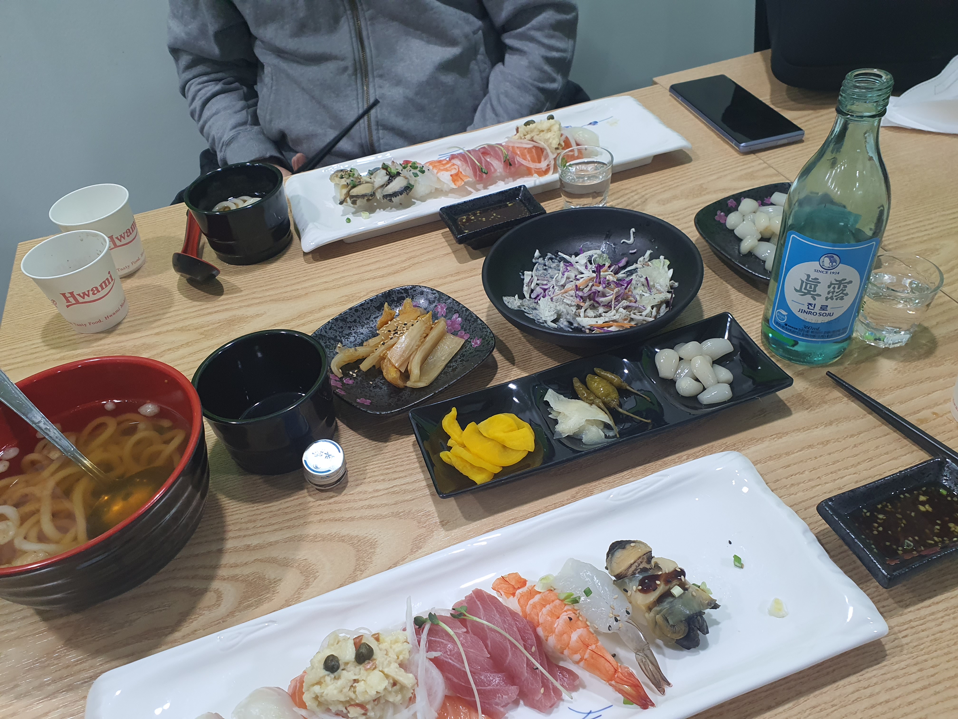 모듬초밥을 시식하기전에 지인들과 고단을 하루를 마무리하면서 소주 한병은 덤!