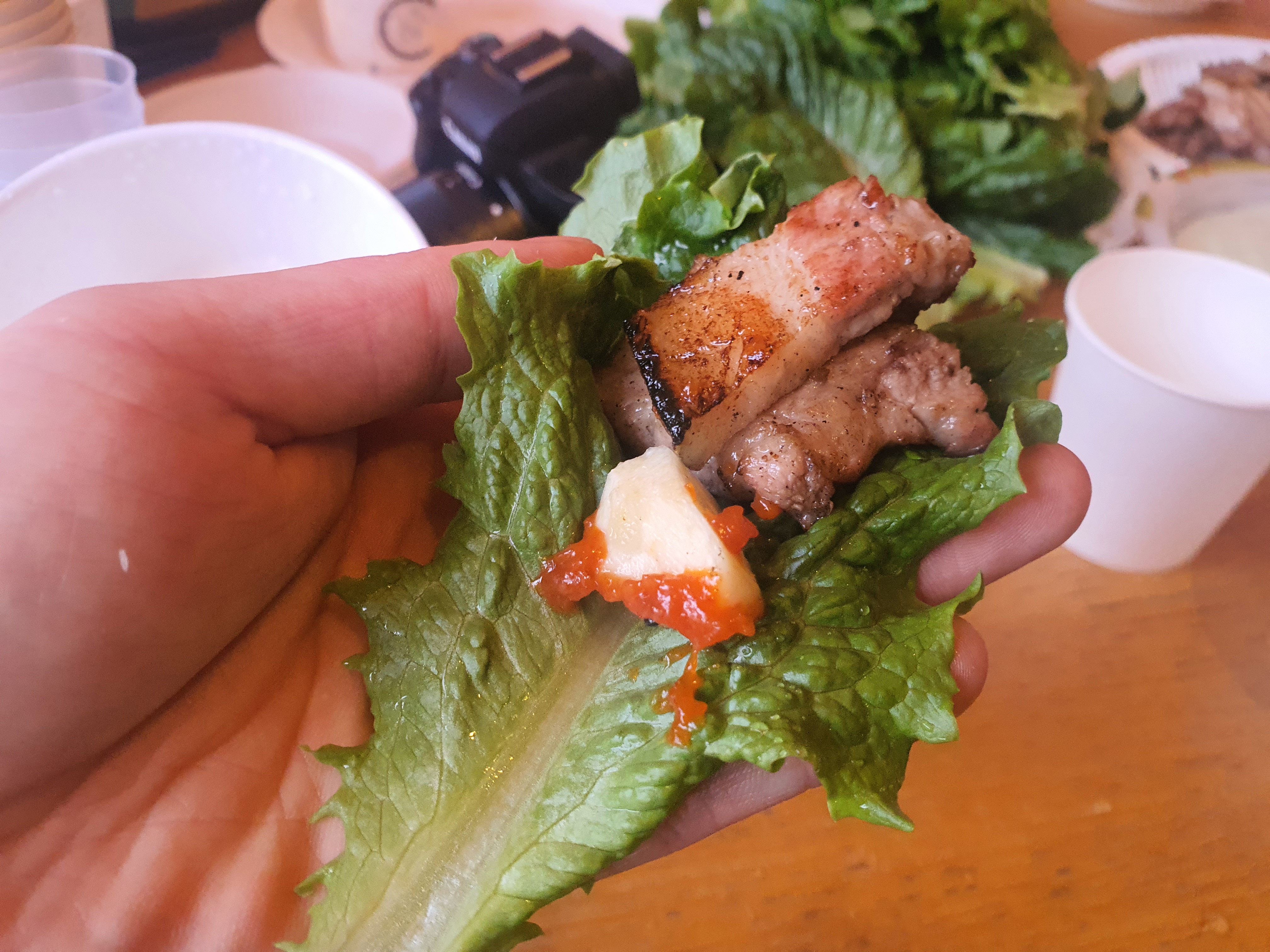 두툼한 삼겹살 2점을 쌈에 마늘과 쌈장을 곁들여 입안으로 바로 직행!