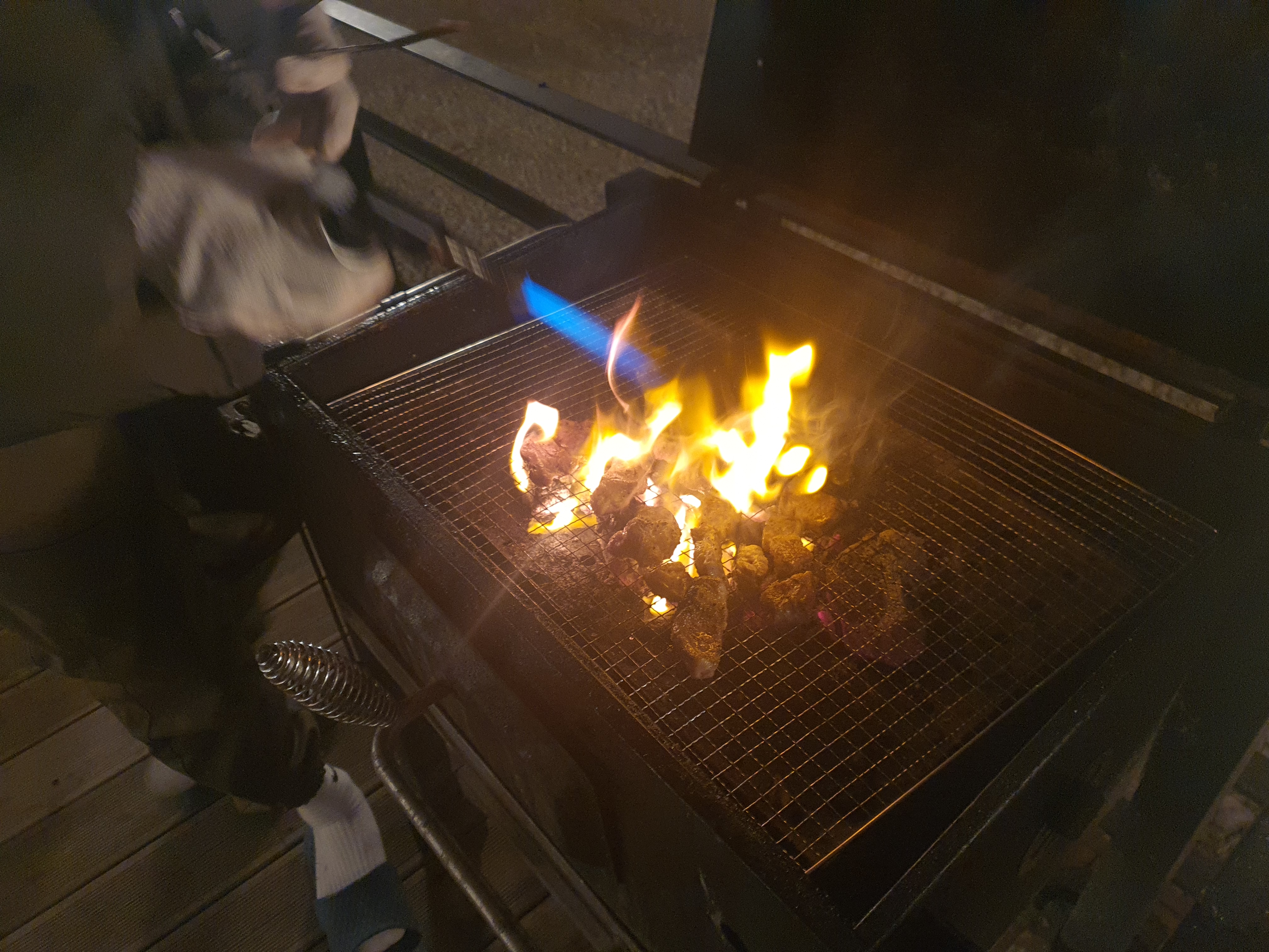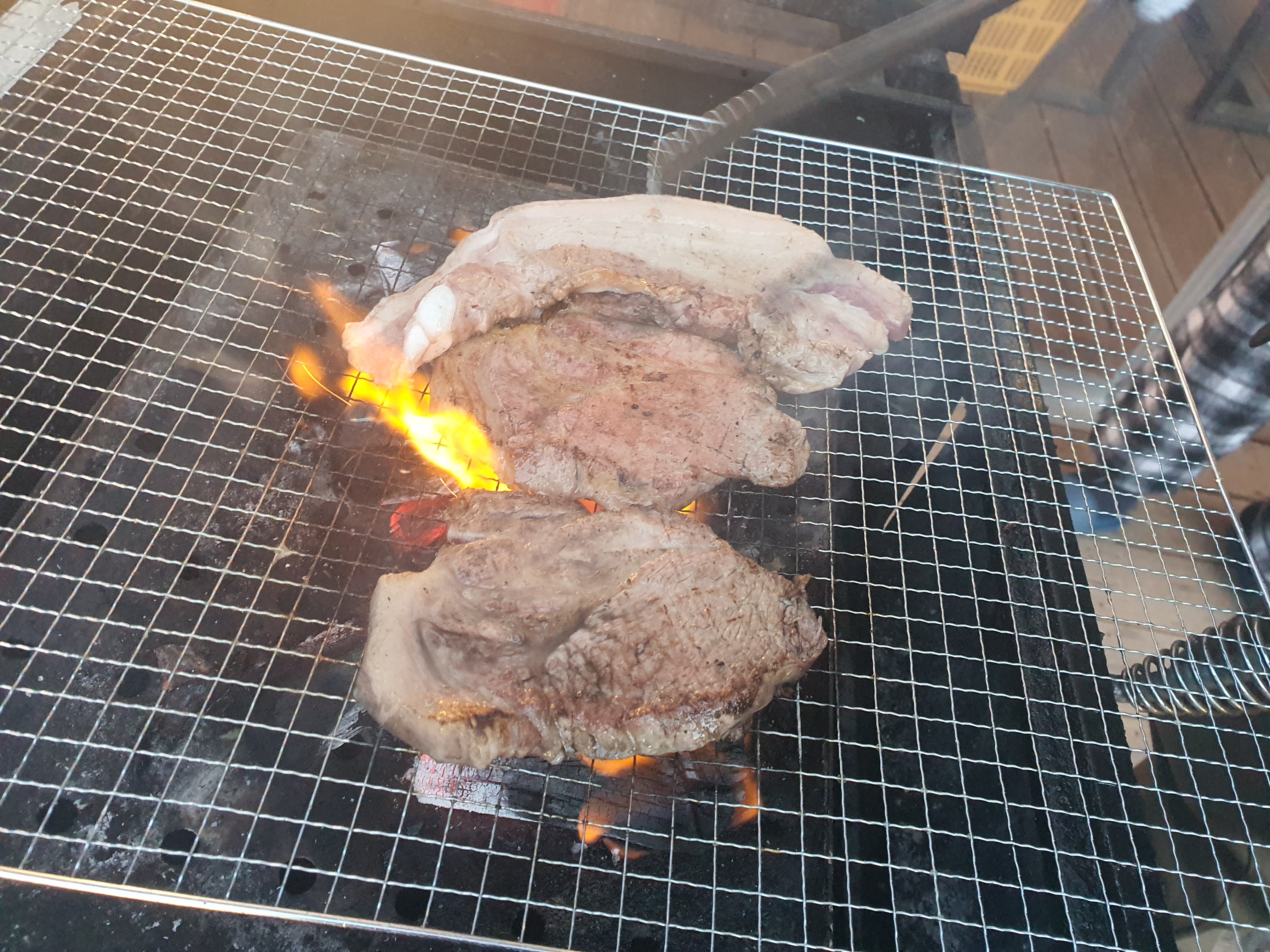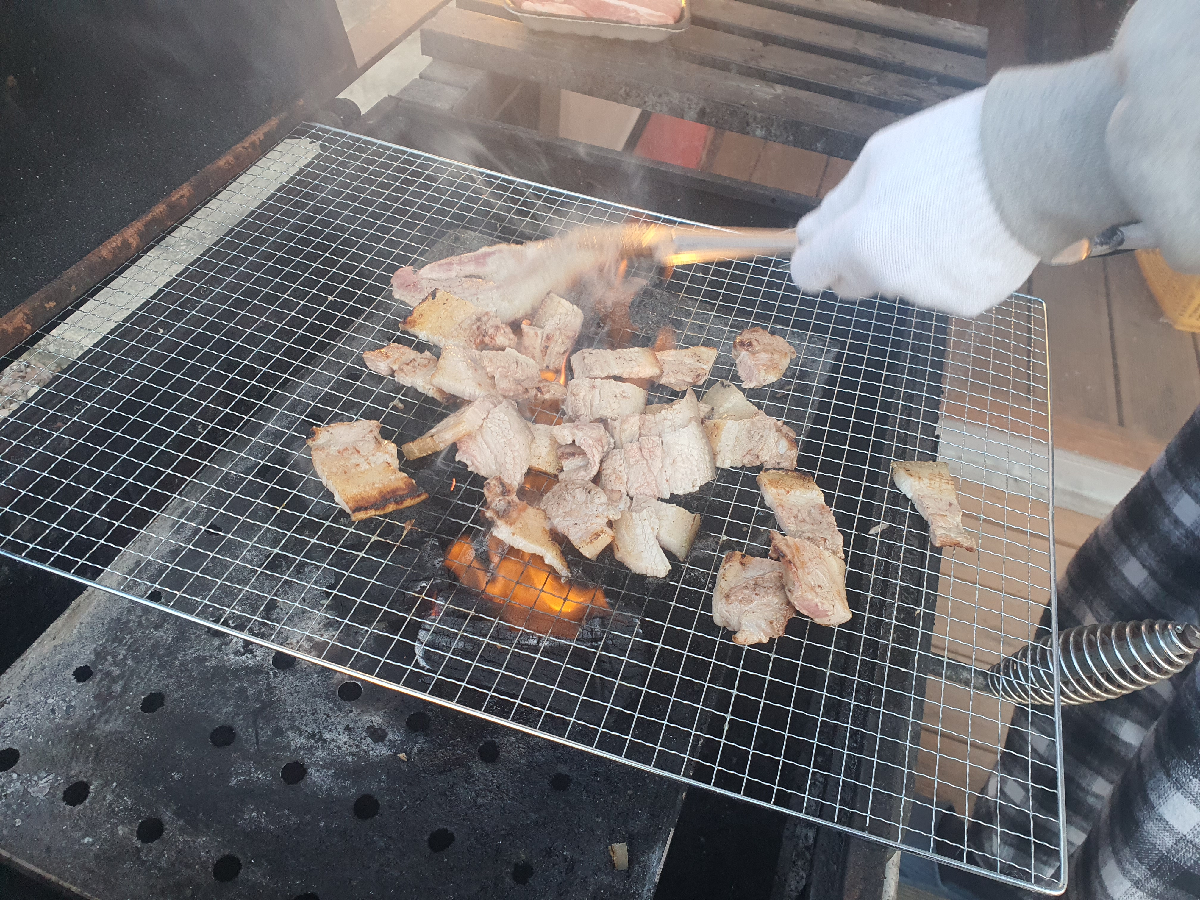 어두워짐에도 불구하고 사온 고기를 다 먹어야하기에 열심히 토치로 지져주고 맛나게 먹었습니다.