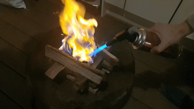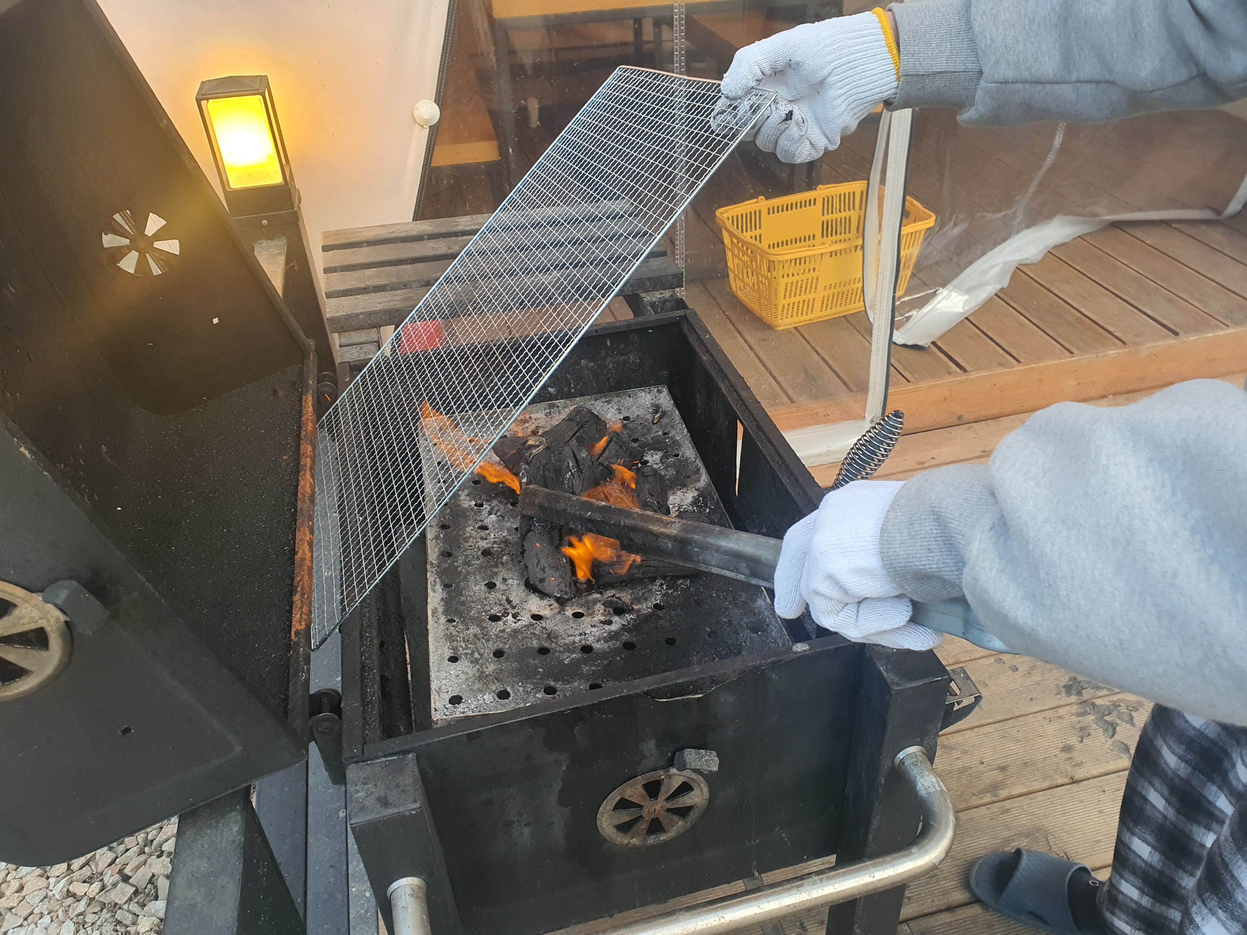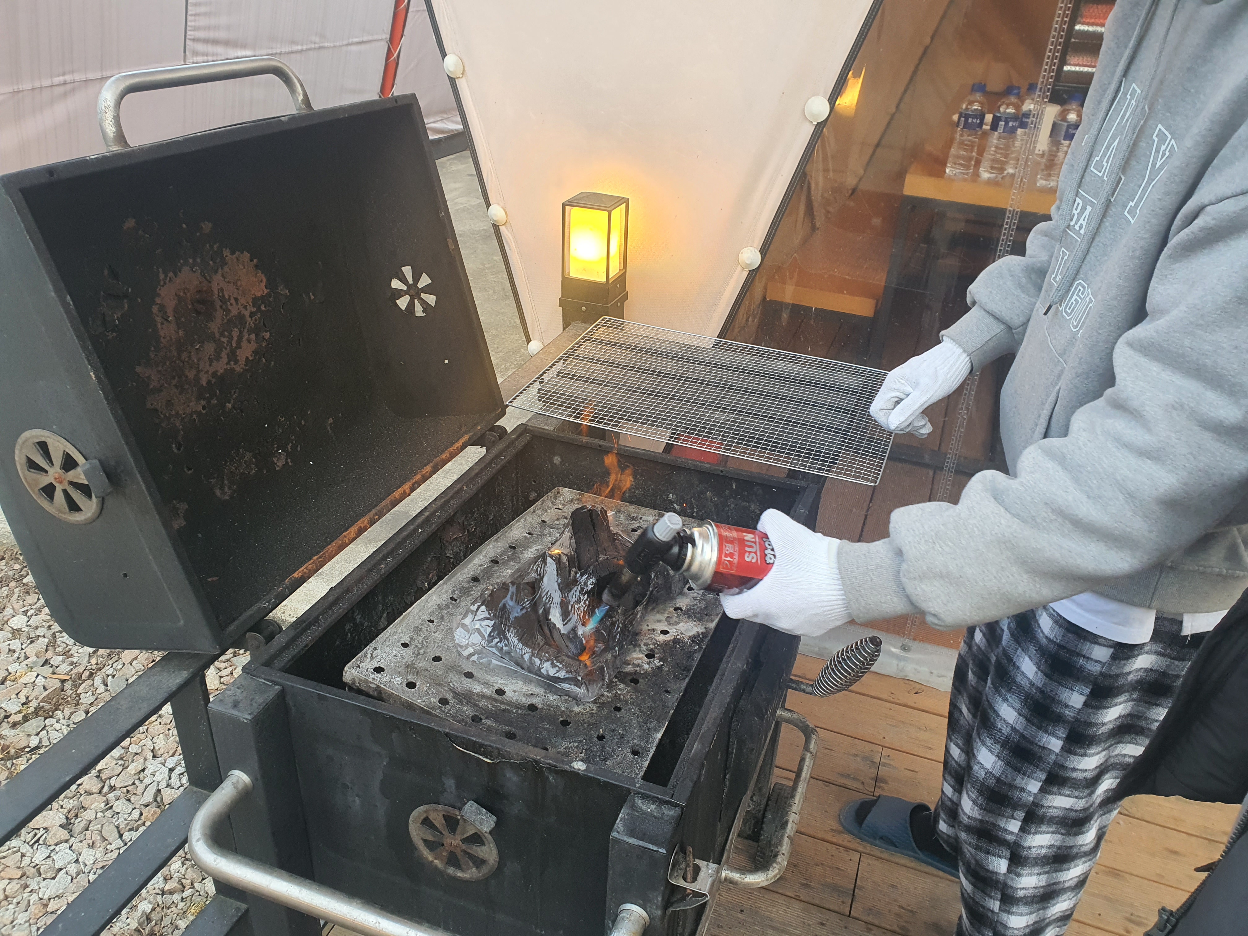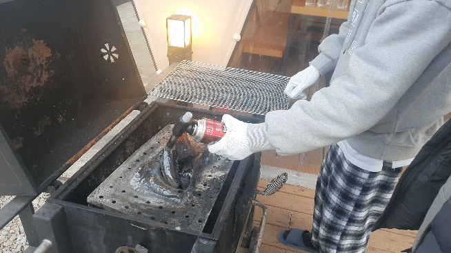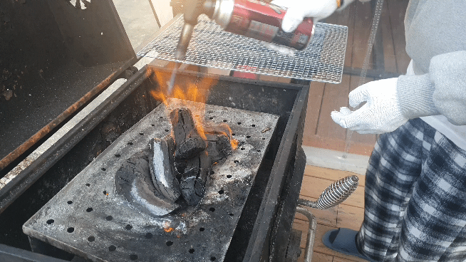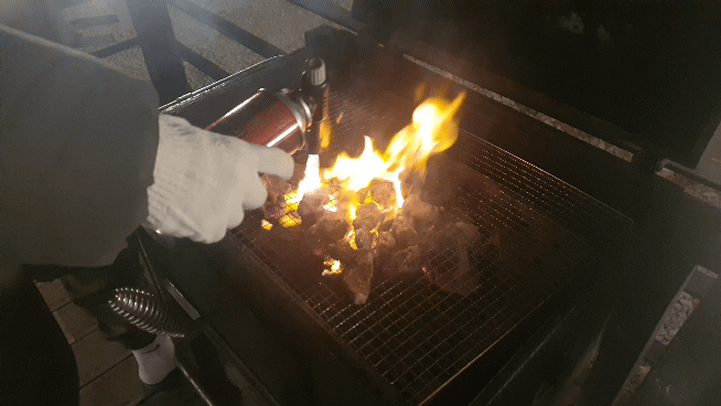 고기를 먹을 그릴에 숯을 넣어주고 토치로 불을 붙여주는 모습입니다.