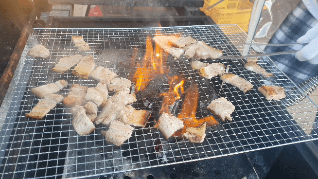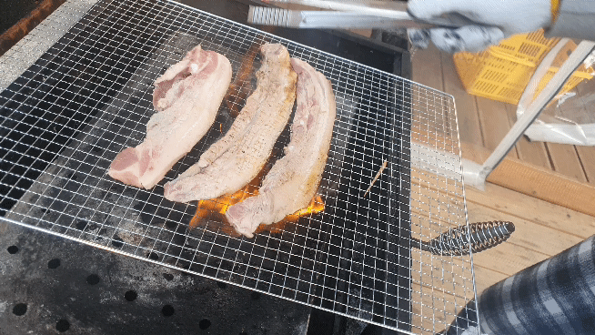 맛좋은 고기를 판대기에 올려 요리조리 맛나게 굽고 있습니다.