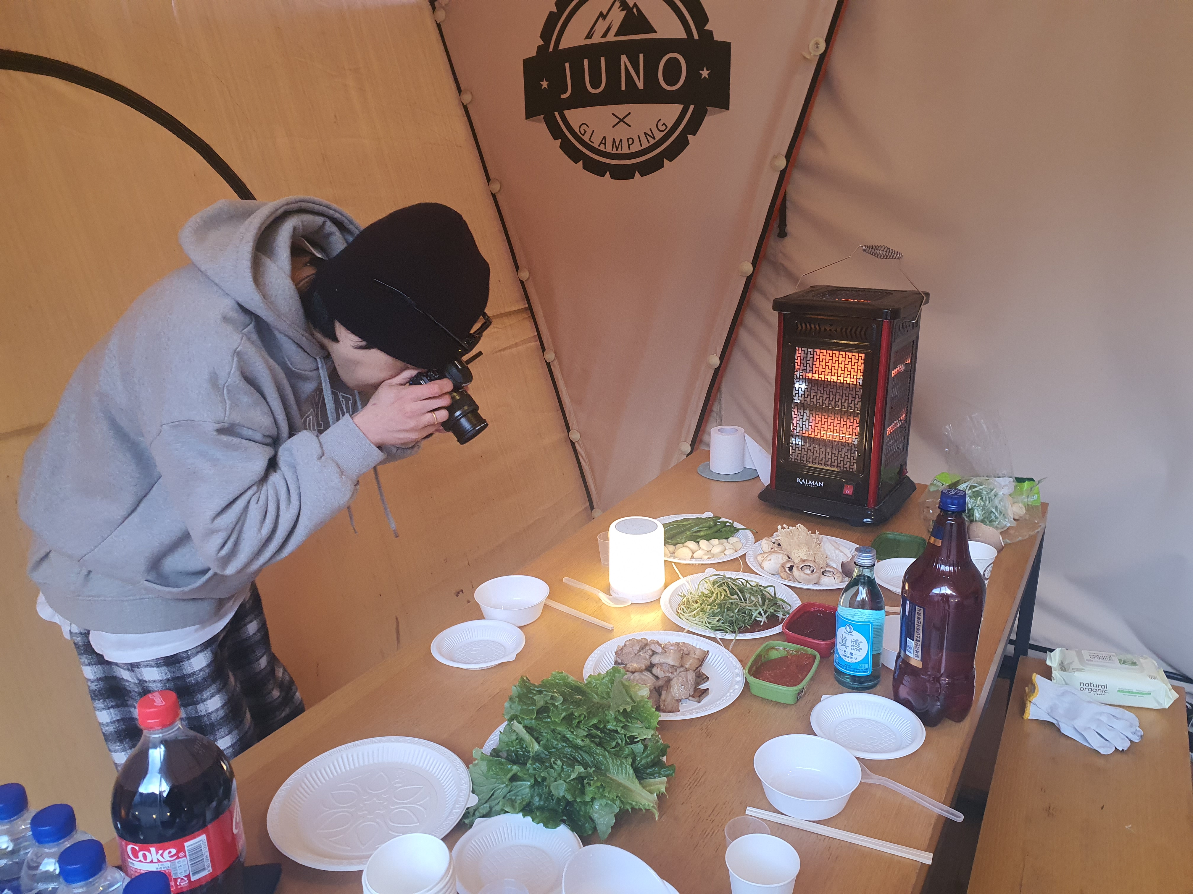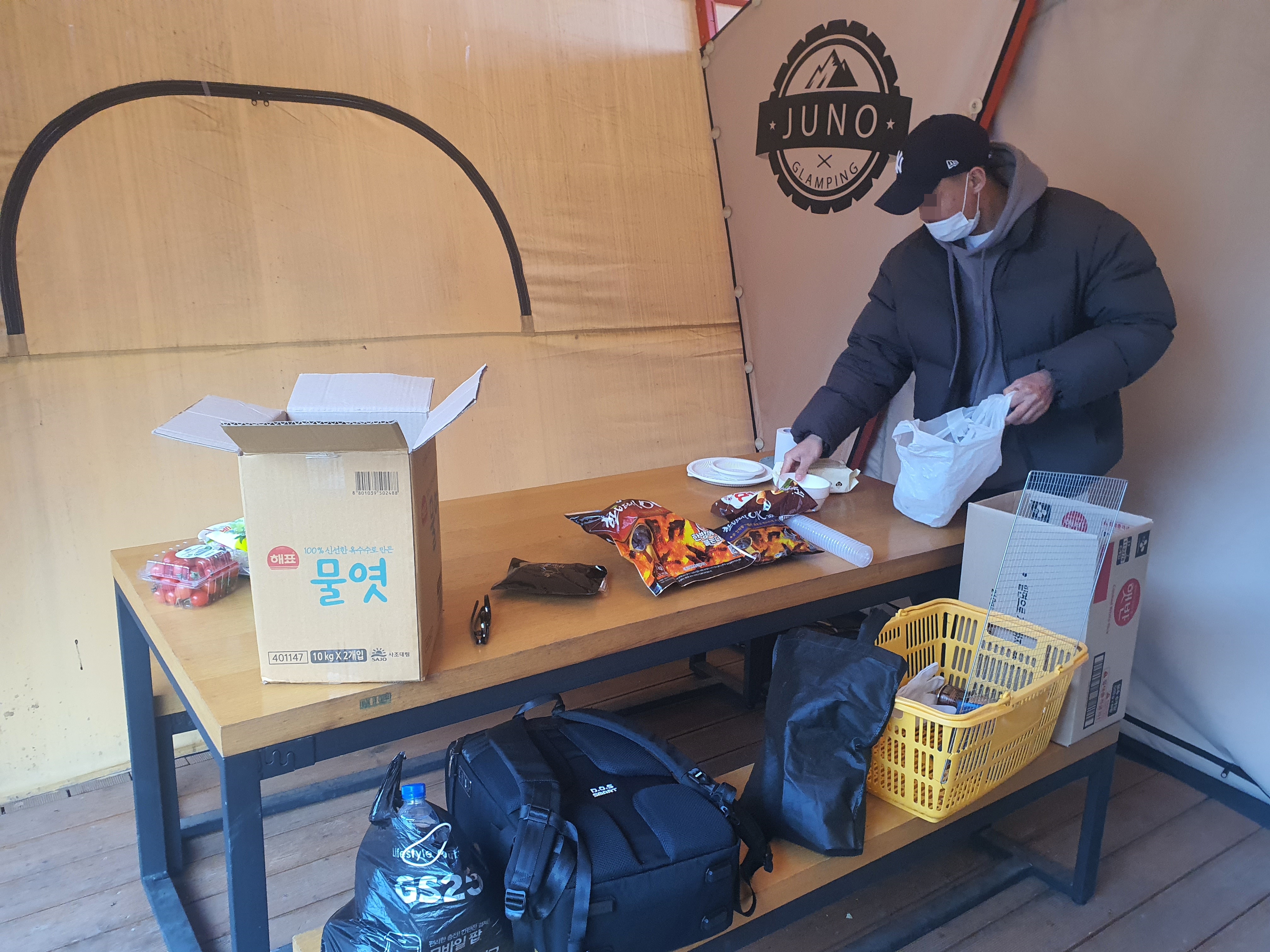 글램핑 내부에 들어와 탁자에 준비해온 음식들을 꺼내 셋팅 준비!