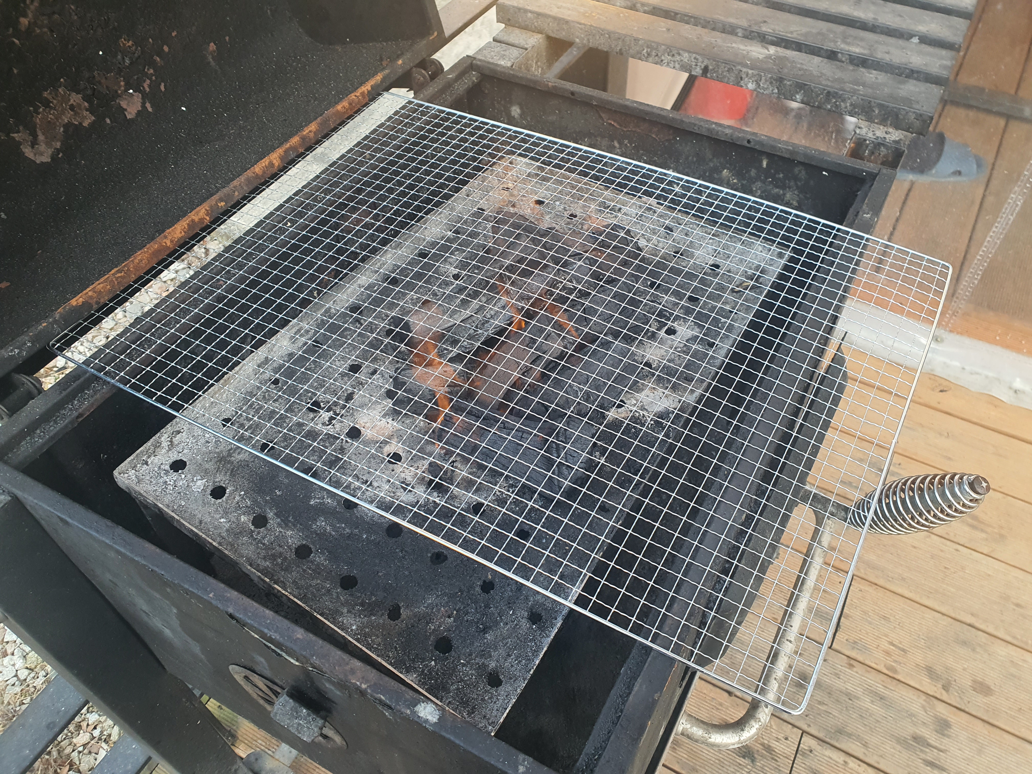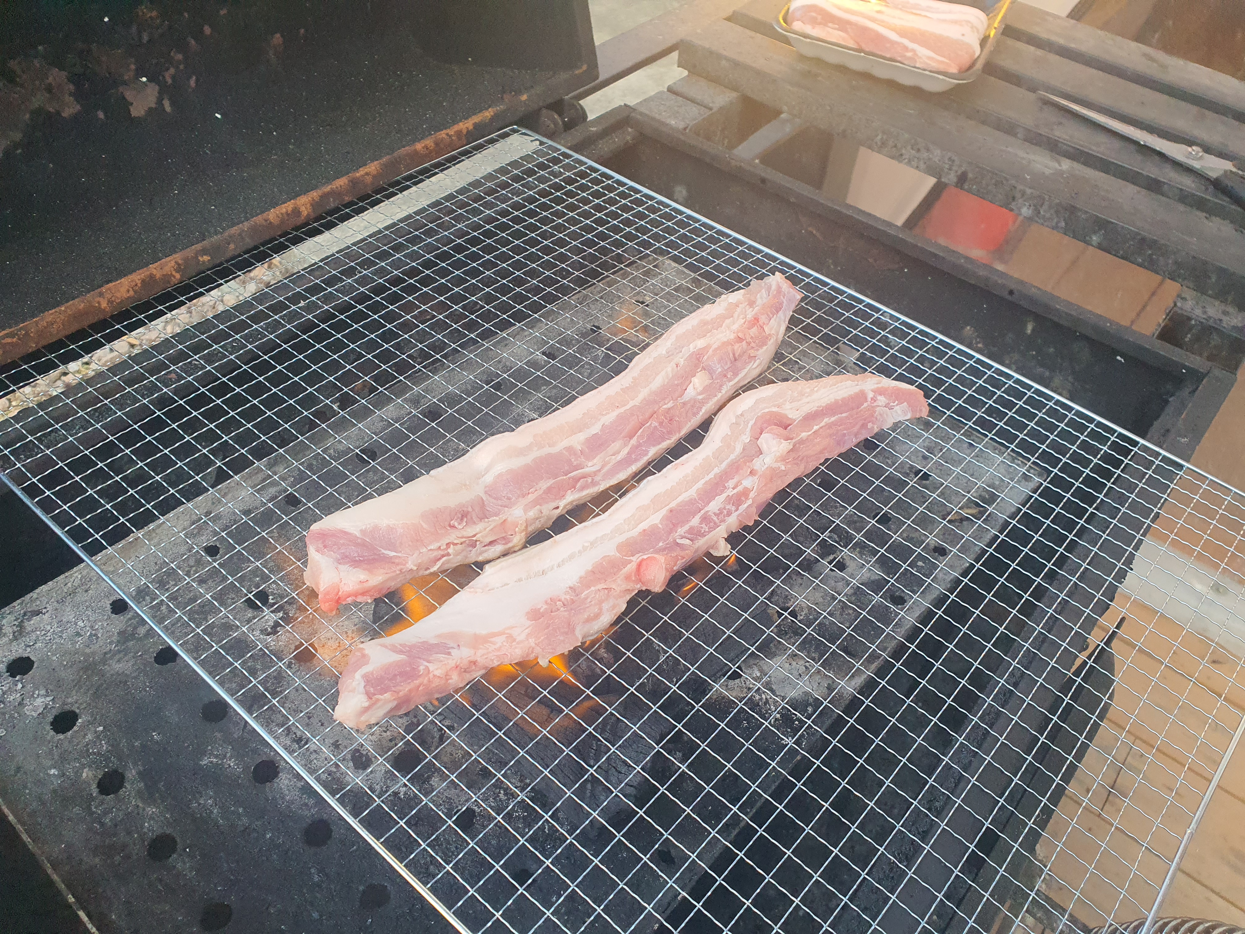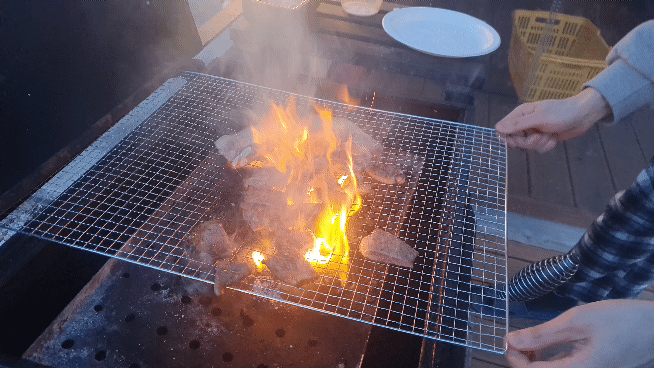 숯에 불을 잘지폈으면 고기를 구울 판대기를 올려줍니다.