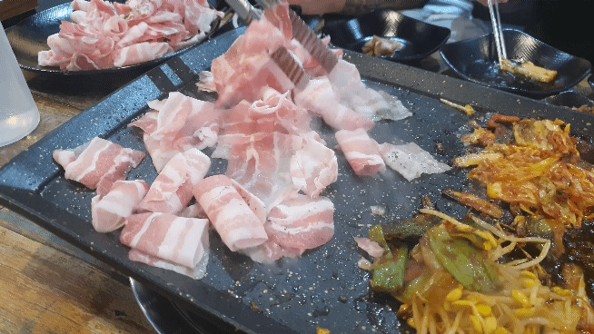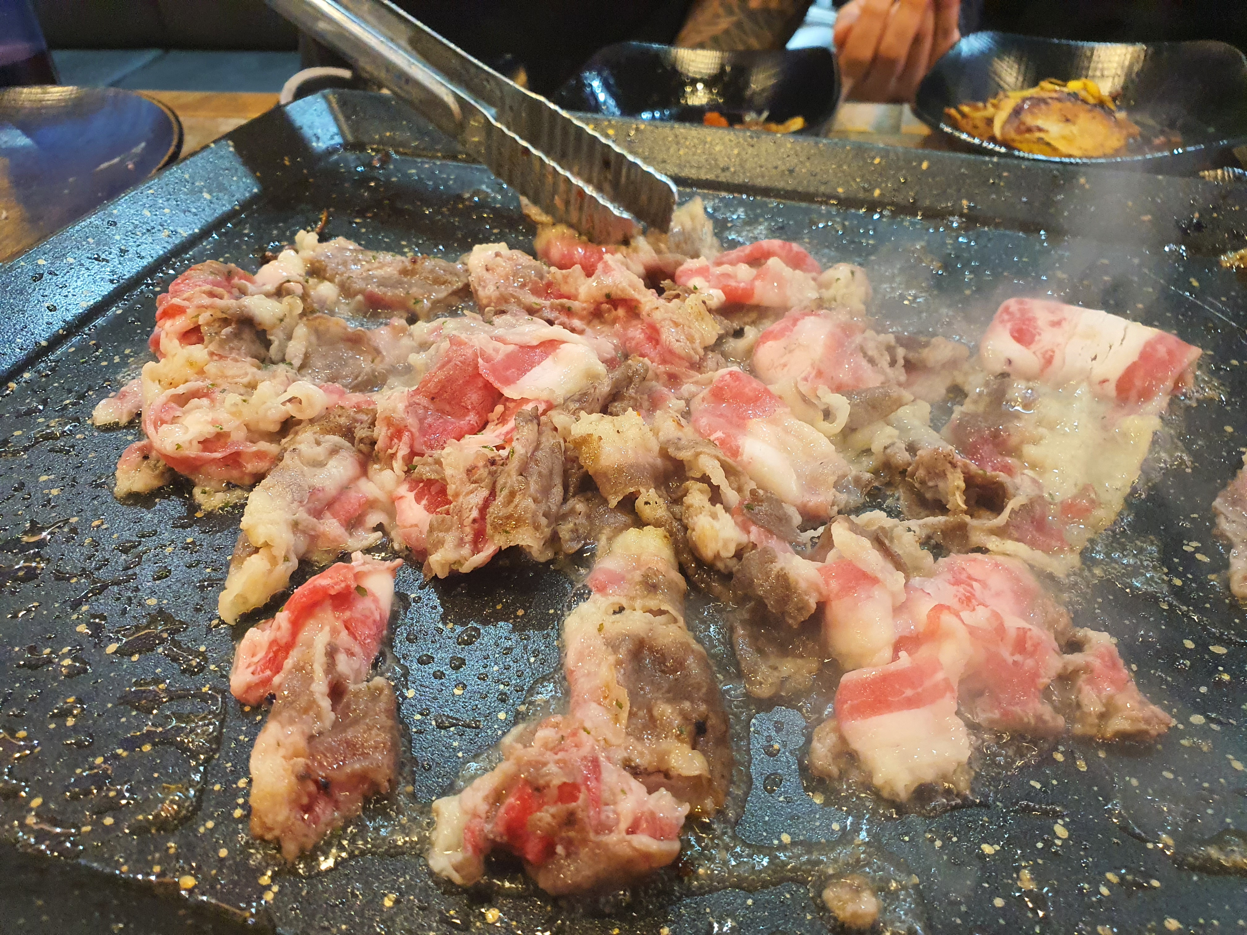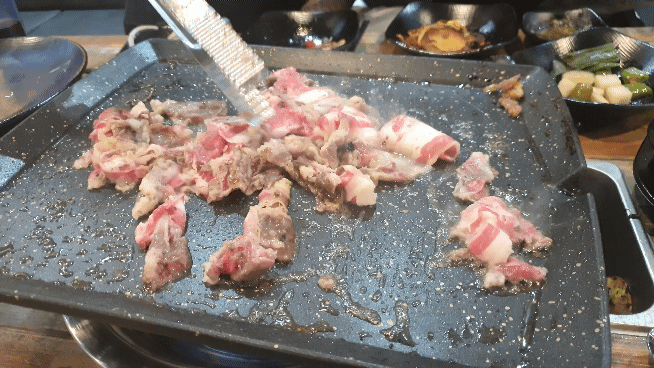 구운건 빨리 먹고 새롭게 빨리빨리 불판에 대패삼겹살을 얹어줍니다.