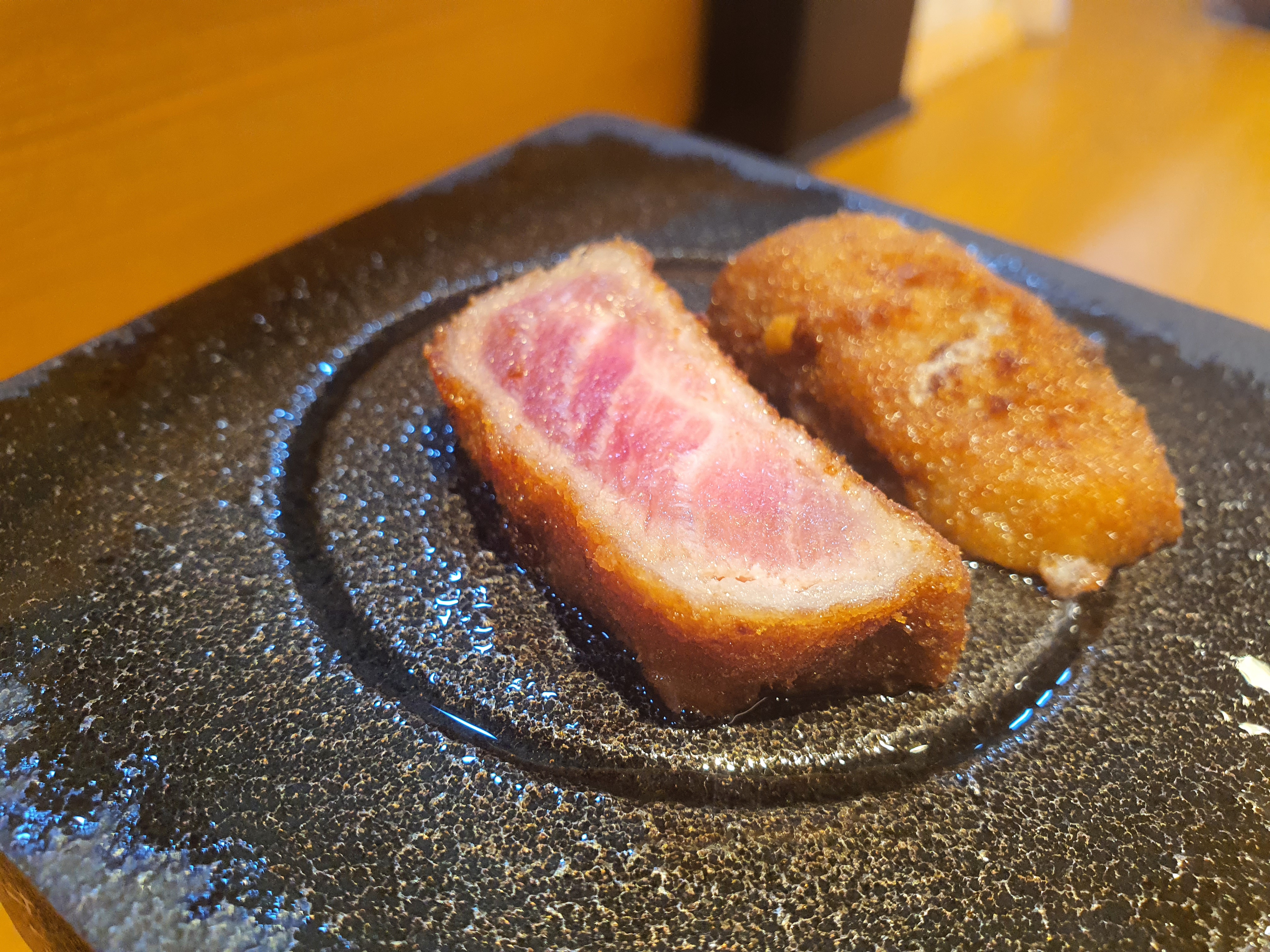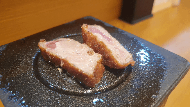 확대해서 찍어보니 튀김안의 고기땟깔이 아주 곱상하네요.