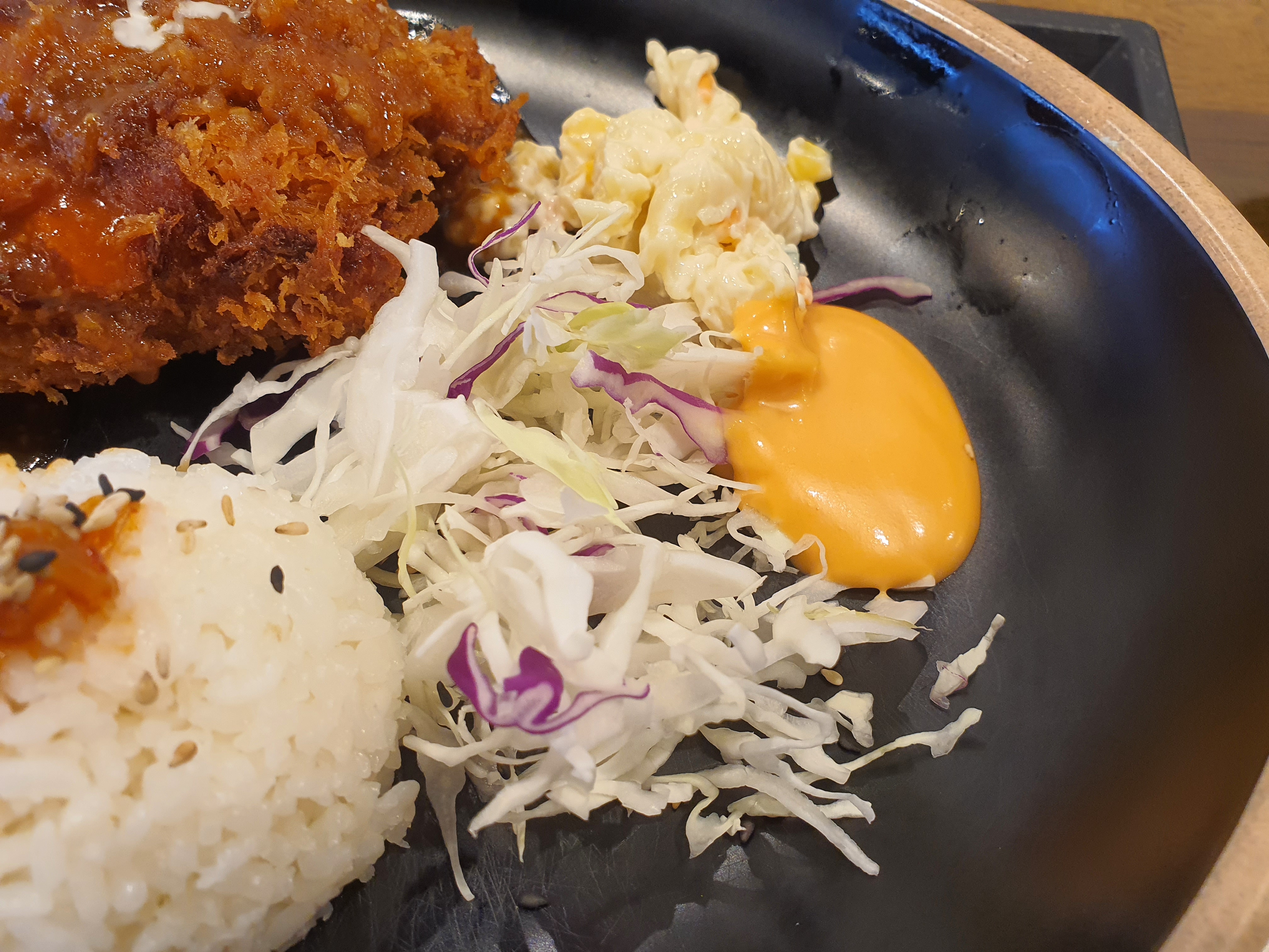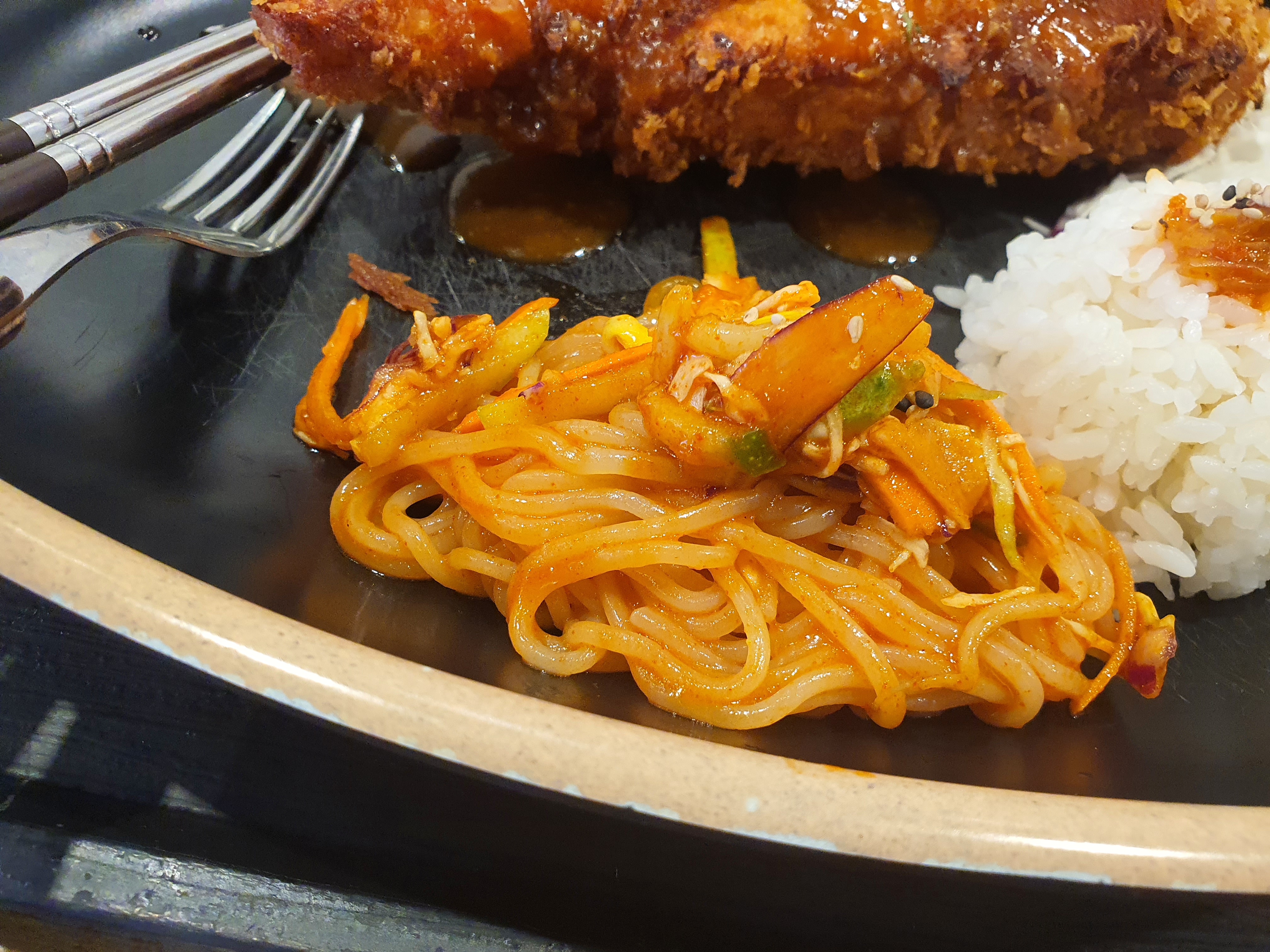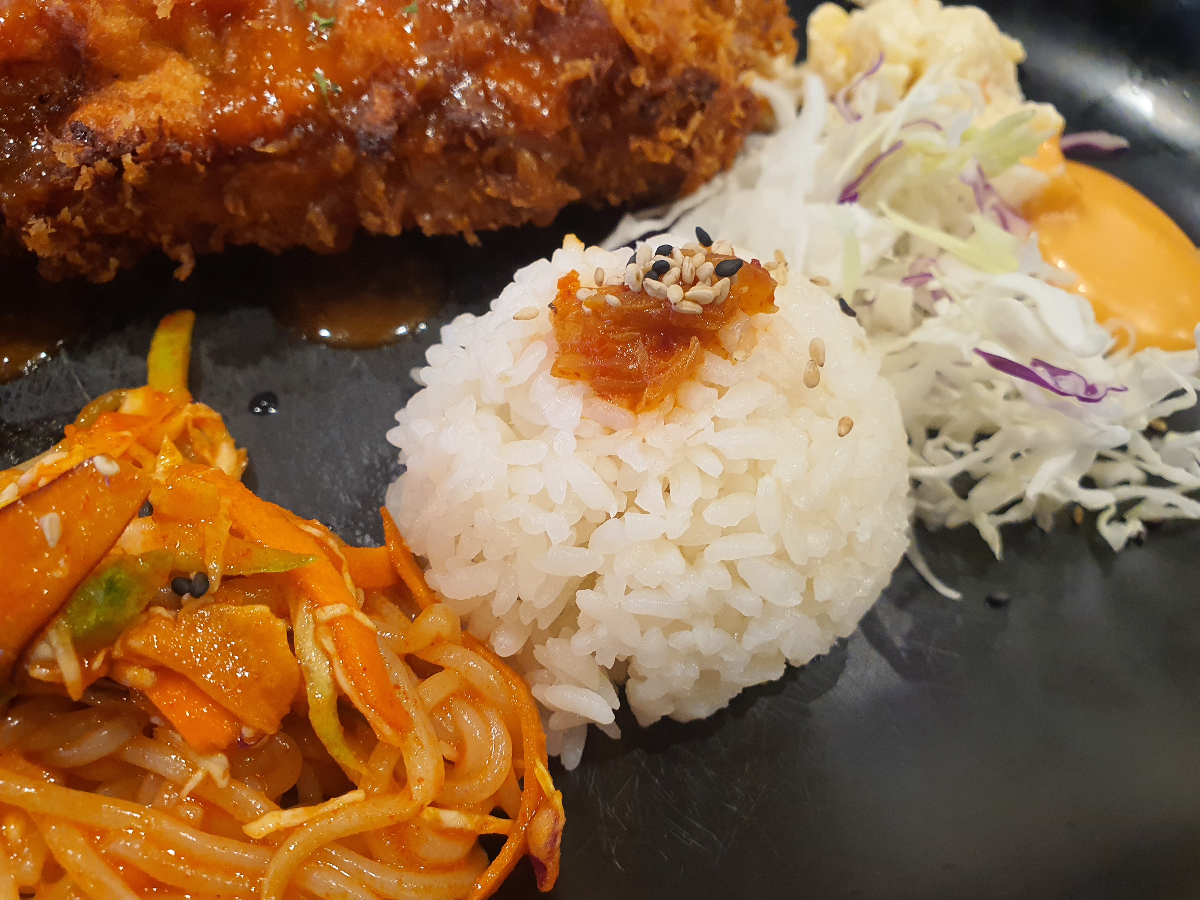 무공돈까스를 주문하면 적당한 밥과 소량의 쫄면 그리고 약간의 샐러드가 나오구요.