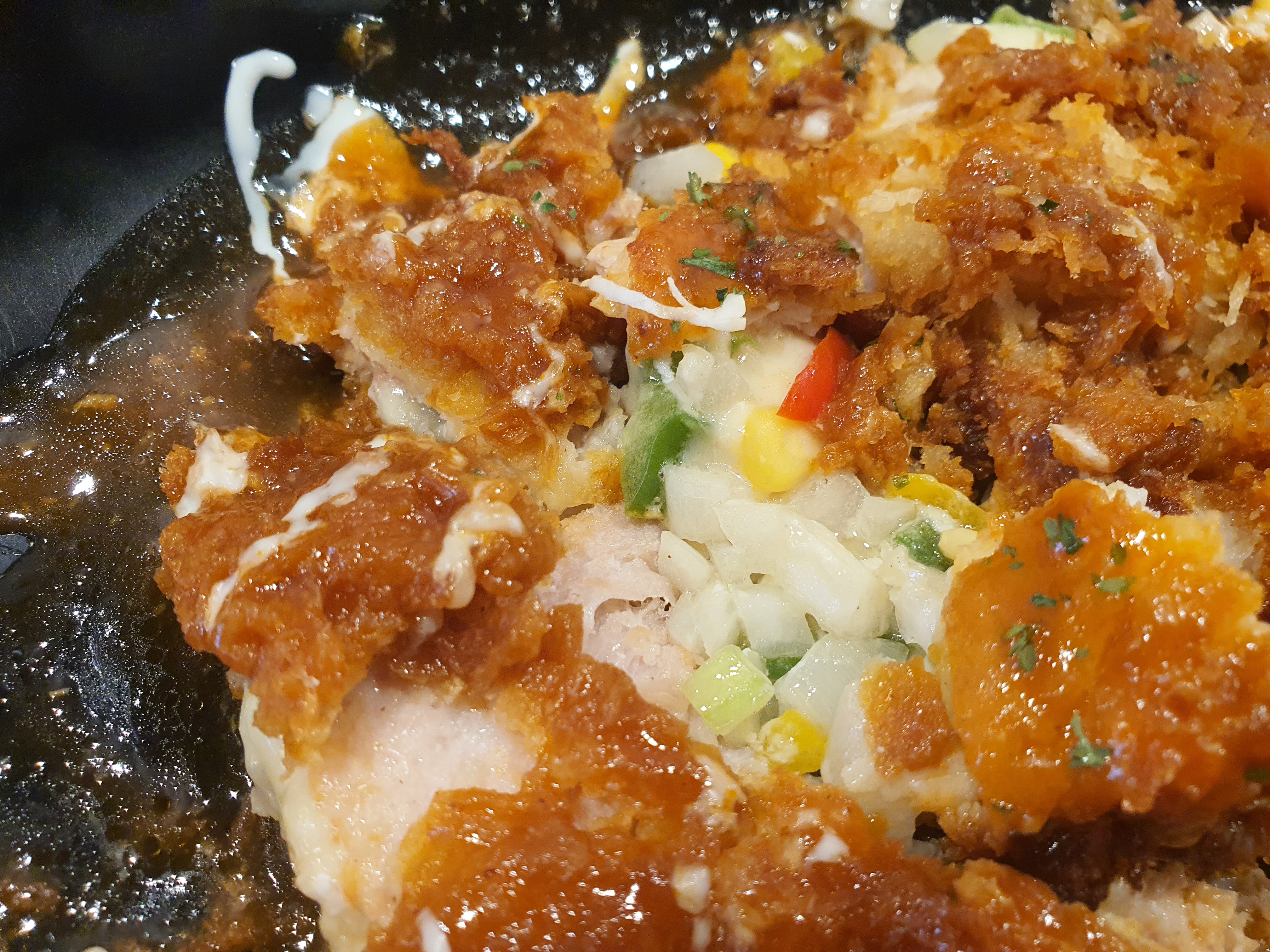 돈까스 튀김안에 있는 속안에 내용물 보시면 치즈와 여러가지 야채의 조합으로 아주 입맛을 다시게 만듭니다.