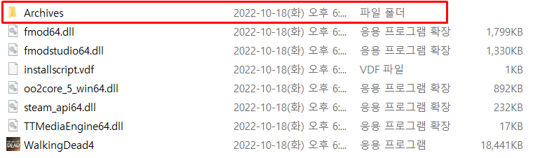 Archives 폴더안으로 압축풀었던 한글패치파일들 전부 붙여넣기해서 덮어쓰기 해주시면 됩니다.
