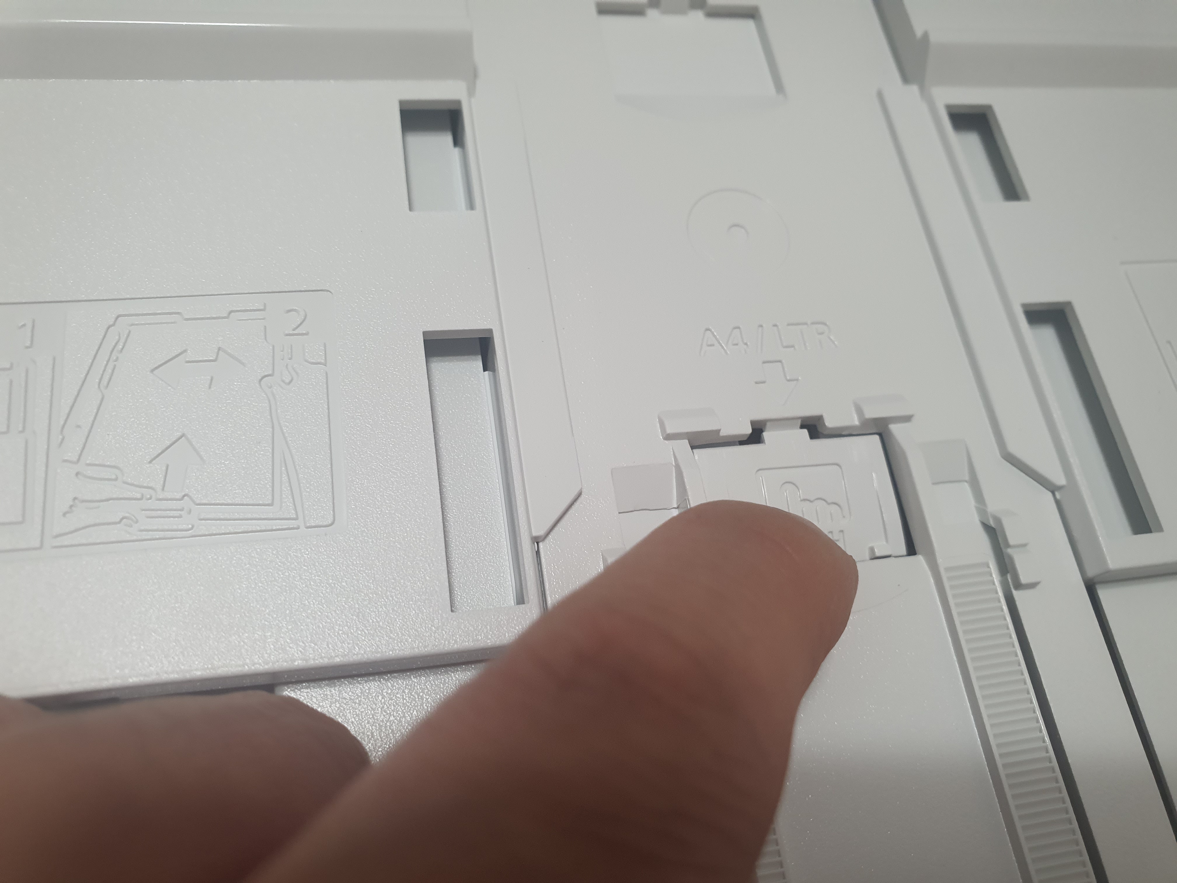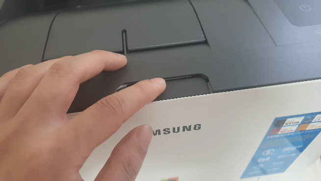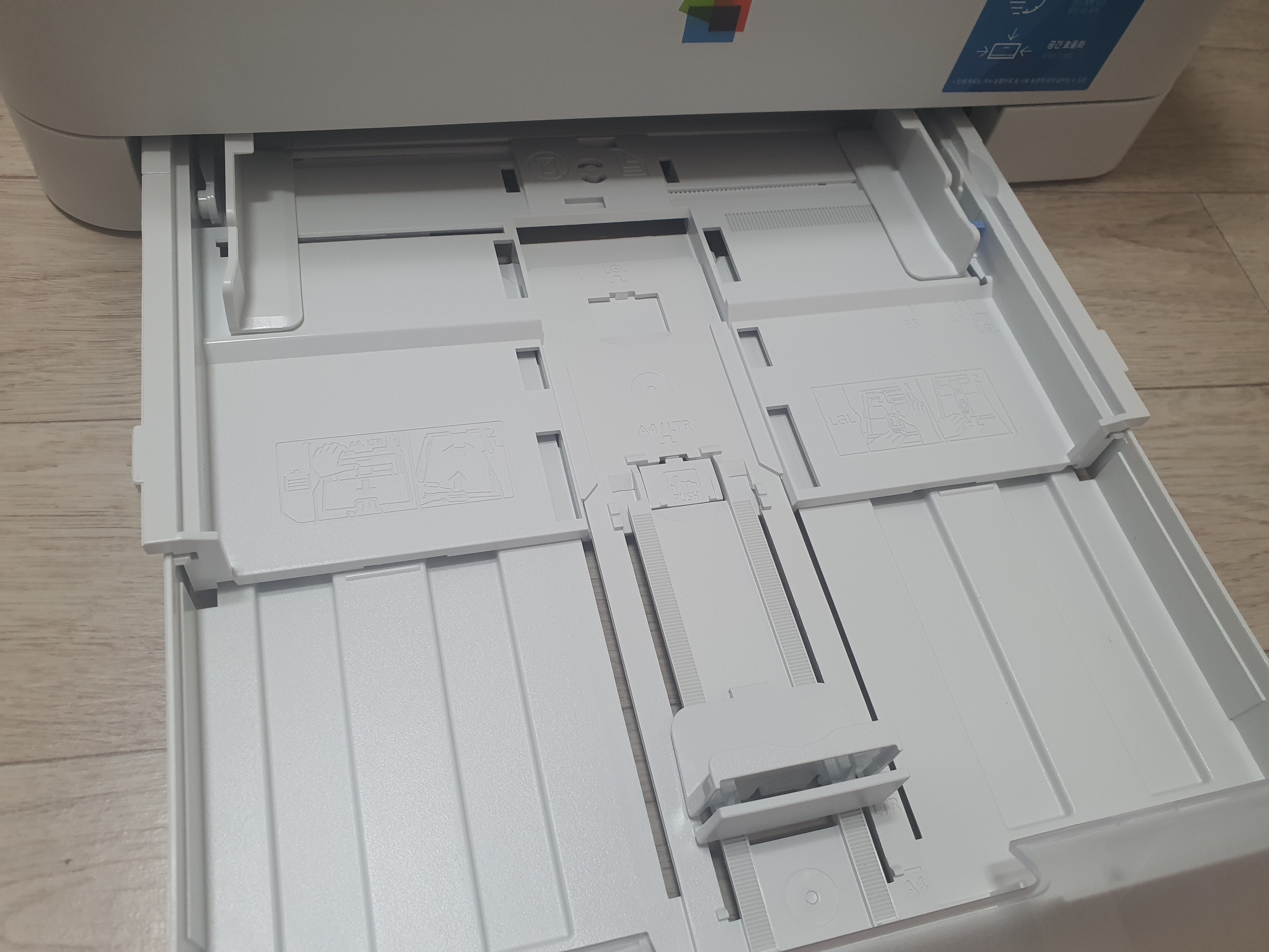 용지칸을 넣고 빼고 할때 처음 사용하시면 왜 이렇게 안들어가지 하실수 있는데 중앙부에 있는 버튼을 누르면서 넣으시면 수월하게 잘들어갑니다.