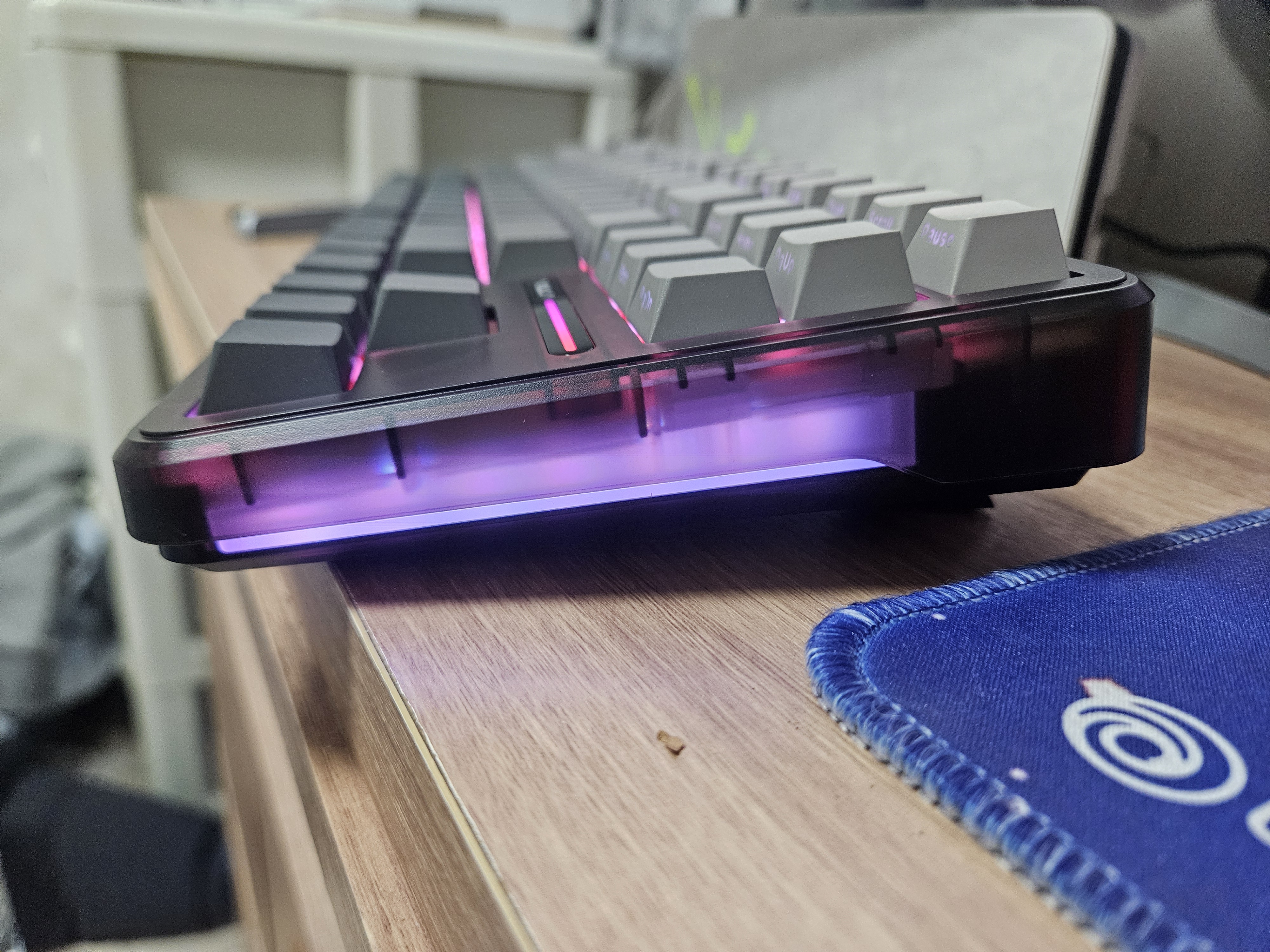 전원을 켜고 조명이 들어오니 다크그레이 색상과 퍼플 조명이 잘 어울리지 않나요?
