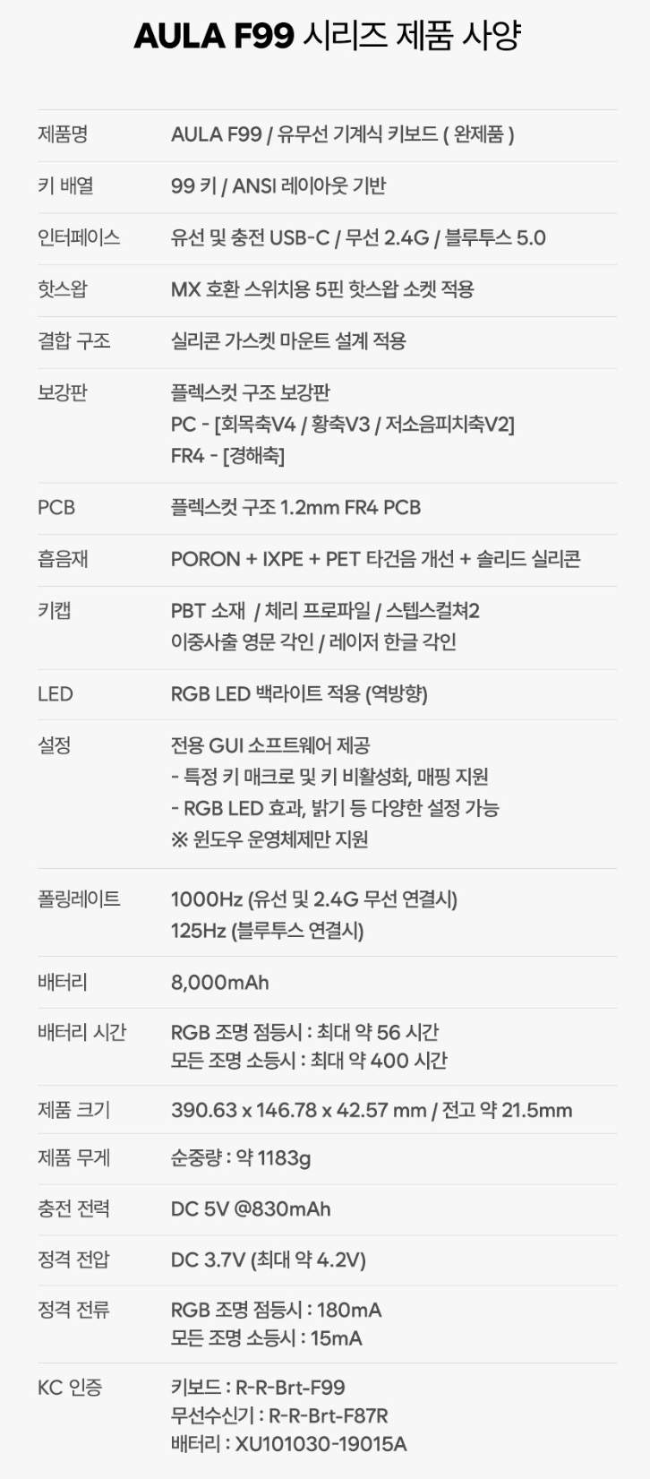 독거미 AULA F99 경해축(화이트) 정발 제품 스펙