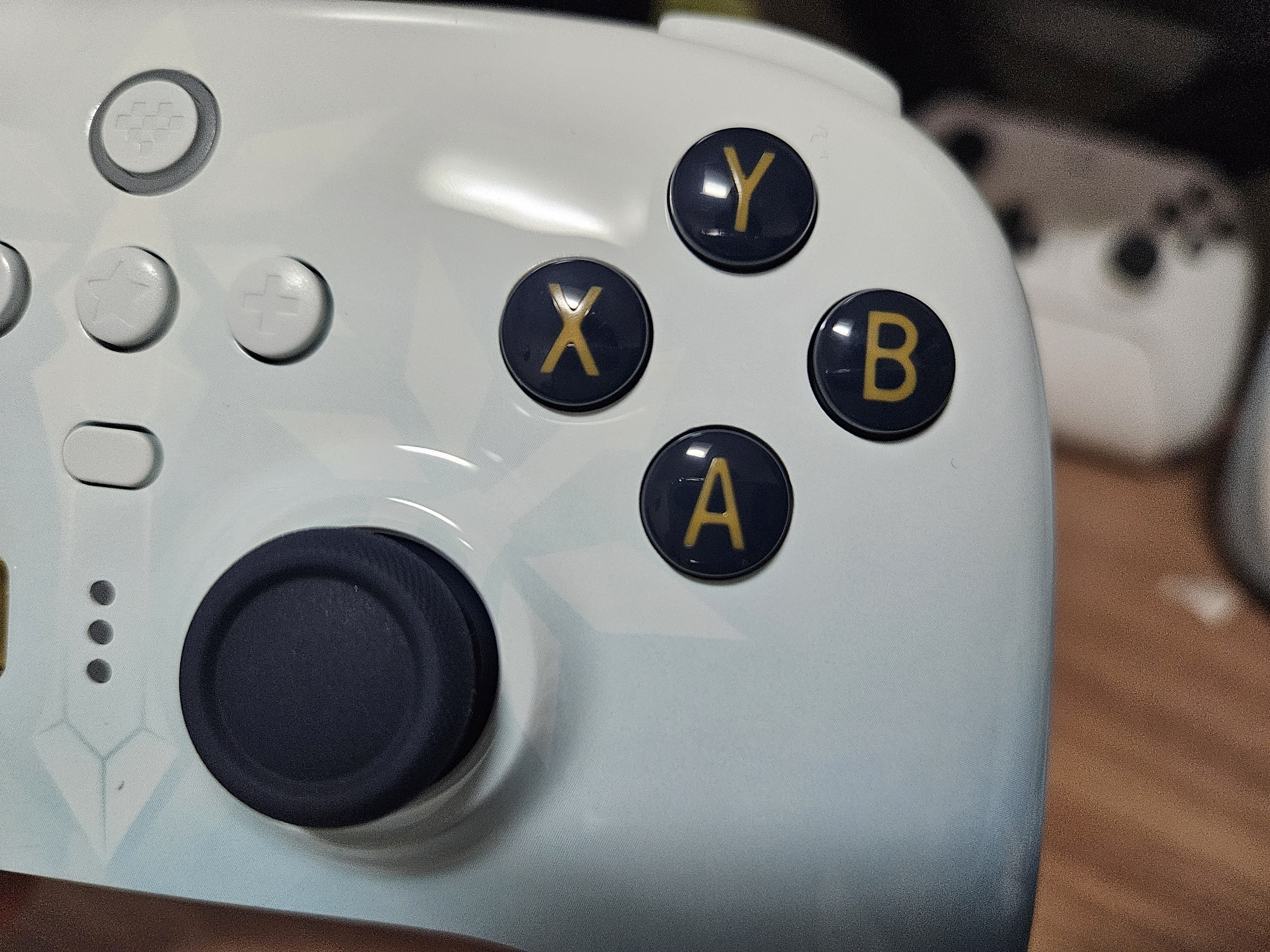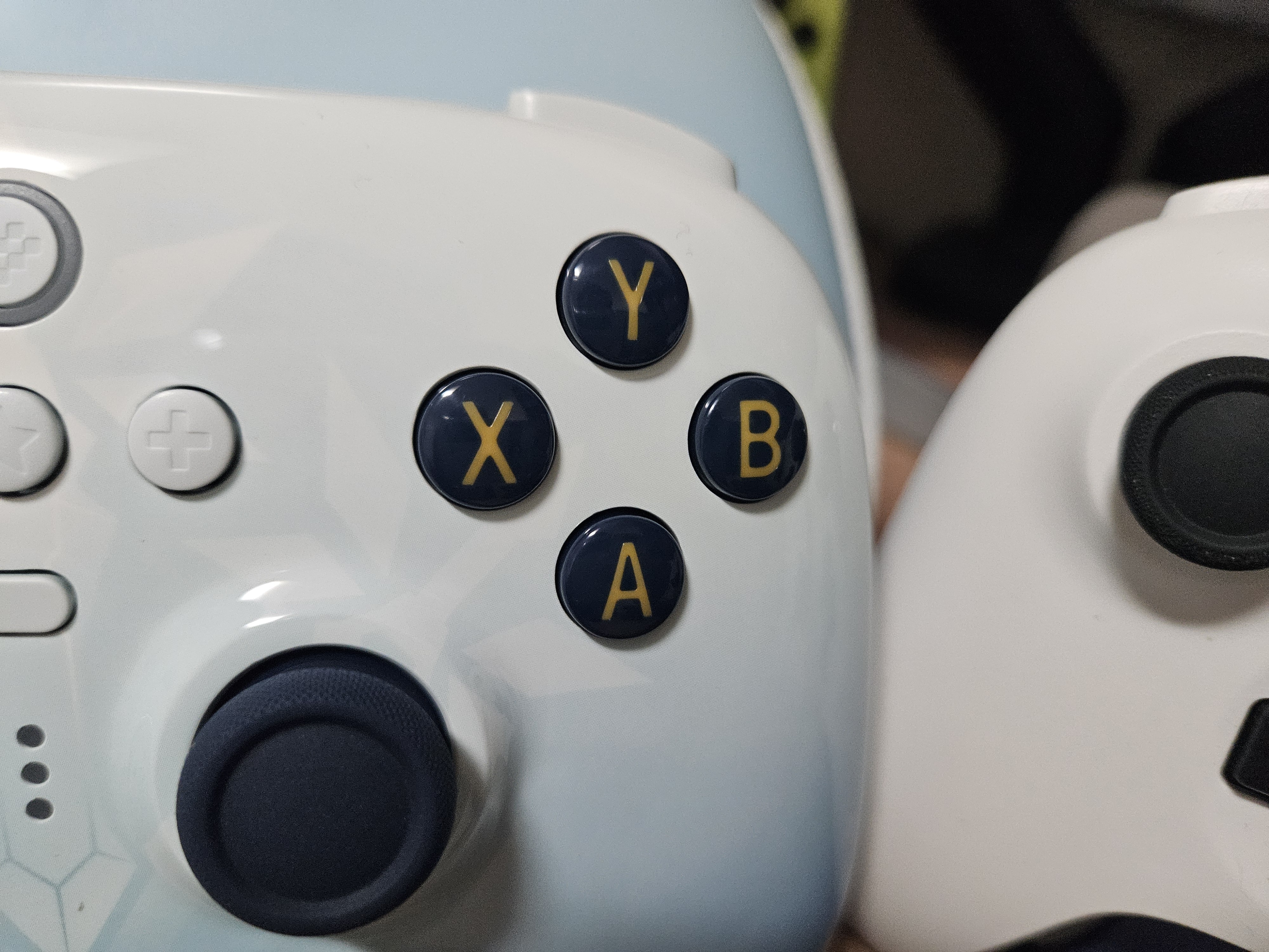 오리지널 제품은 닌텐도까지 겸용으로 사용가능한 제품이라 닌텐도 스타일에 따라 B키가 아래에 위치해있으며 컨트롤러 겉표면이 무광입니다.